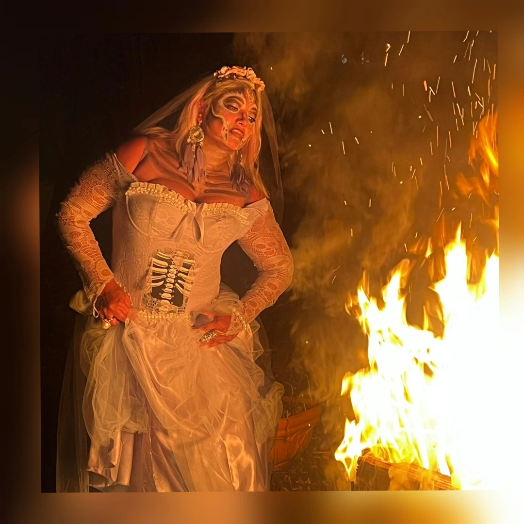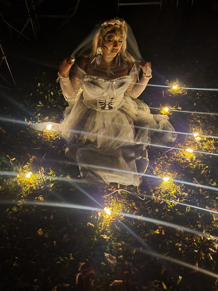 279White bridal costume with lace detailing, long sleeves, and a tulle skirt. Includes a veil. Perfect for Halloween or a themed party.