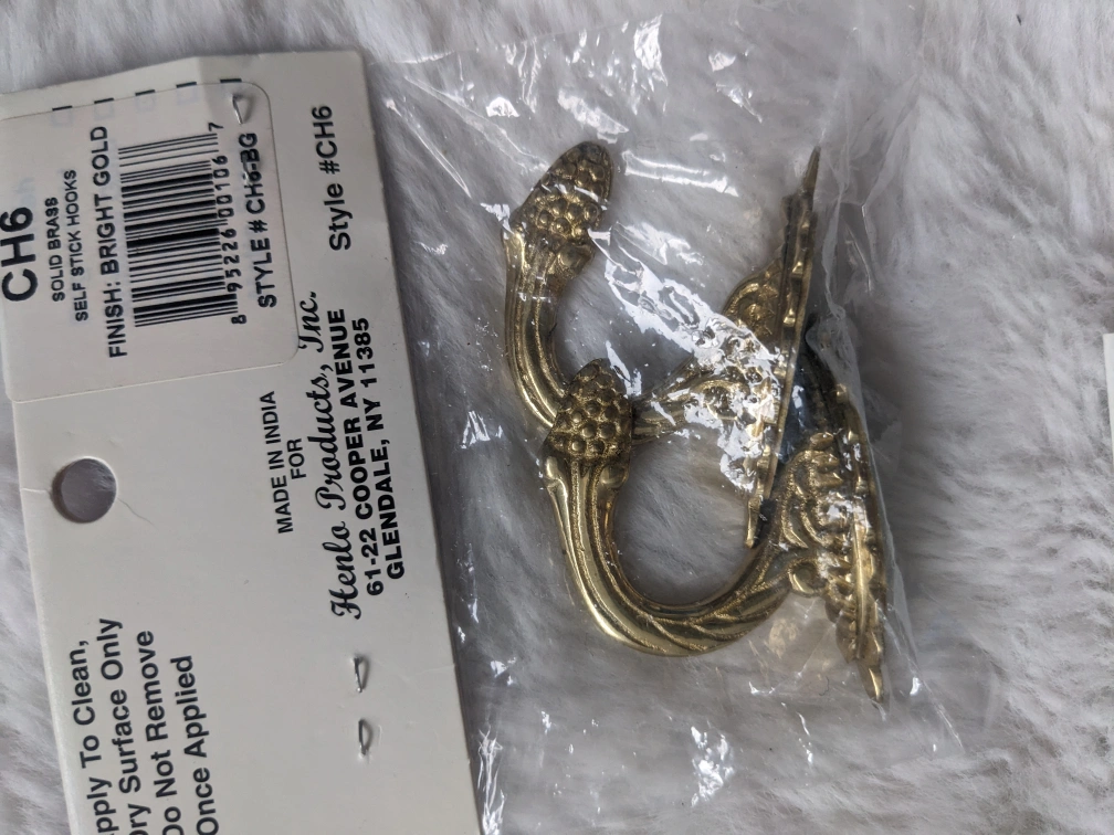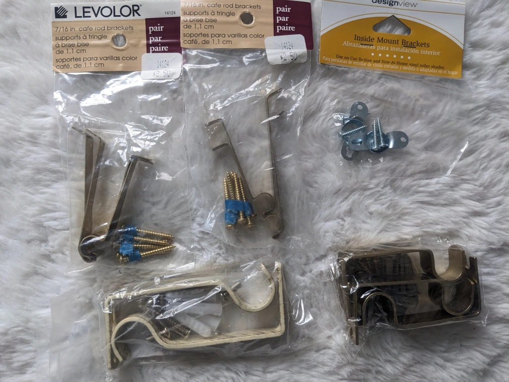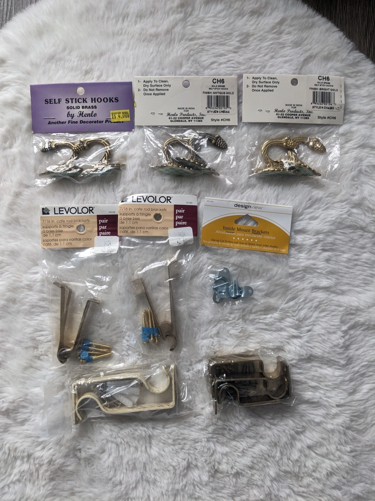 Set of curtain rod brackets, hooks and hardware. Includes Levolor and Designview brand brackets, and Henlo hooks. Brackets support a single curtain rod.