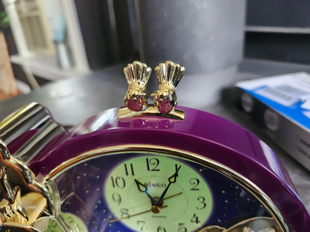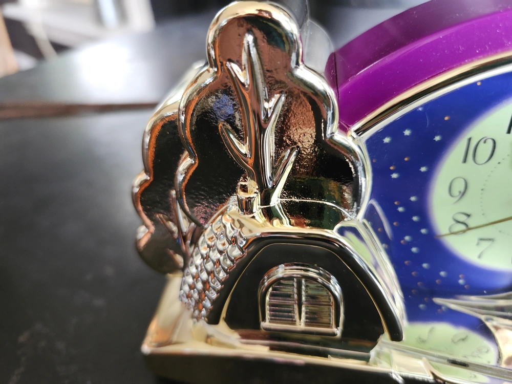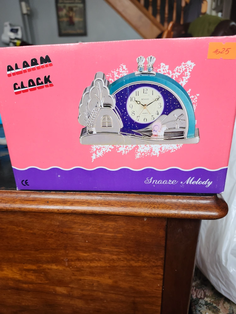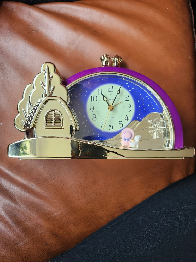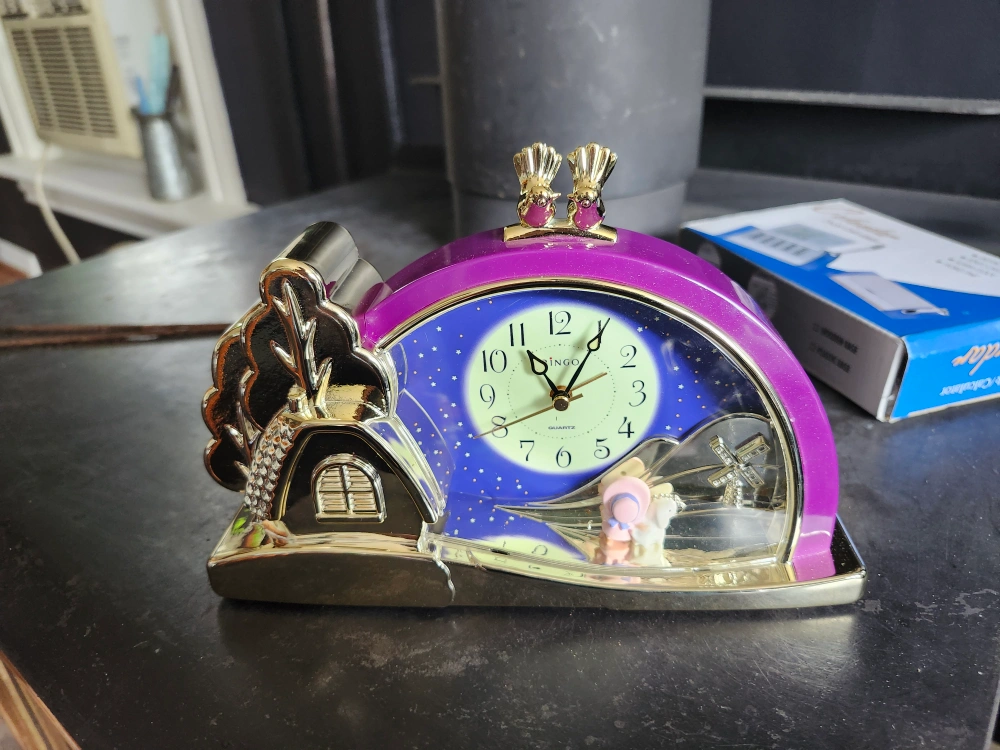 cute little alarm clock. Never used comes with batteries. Great for a little girls room. Very pretty purple color. Lots of detail.