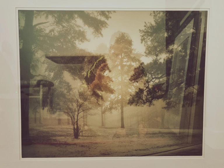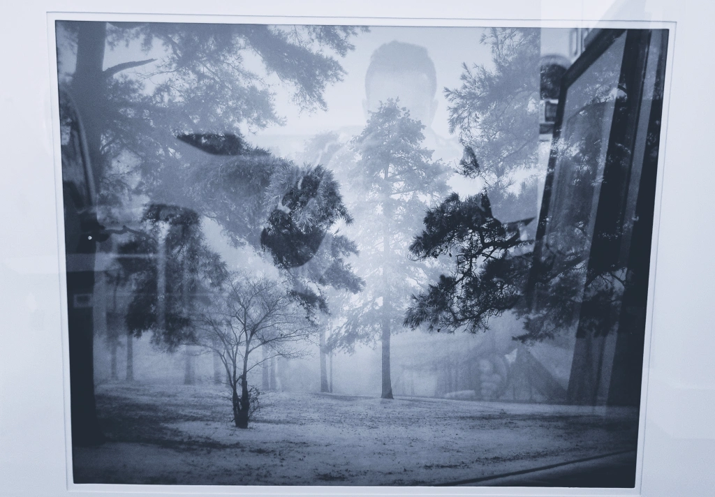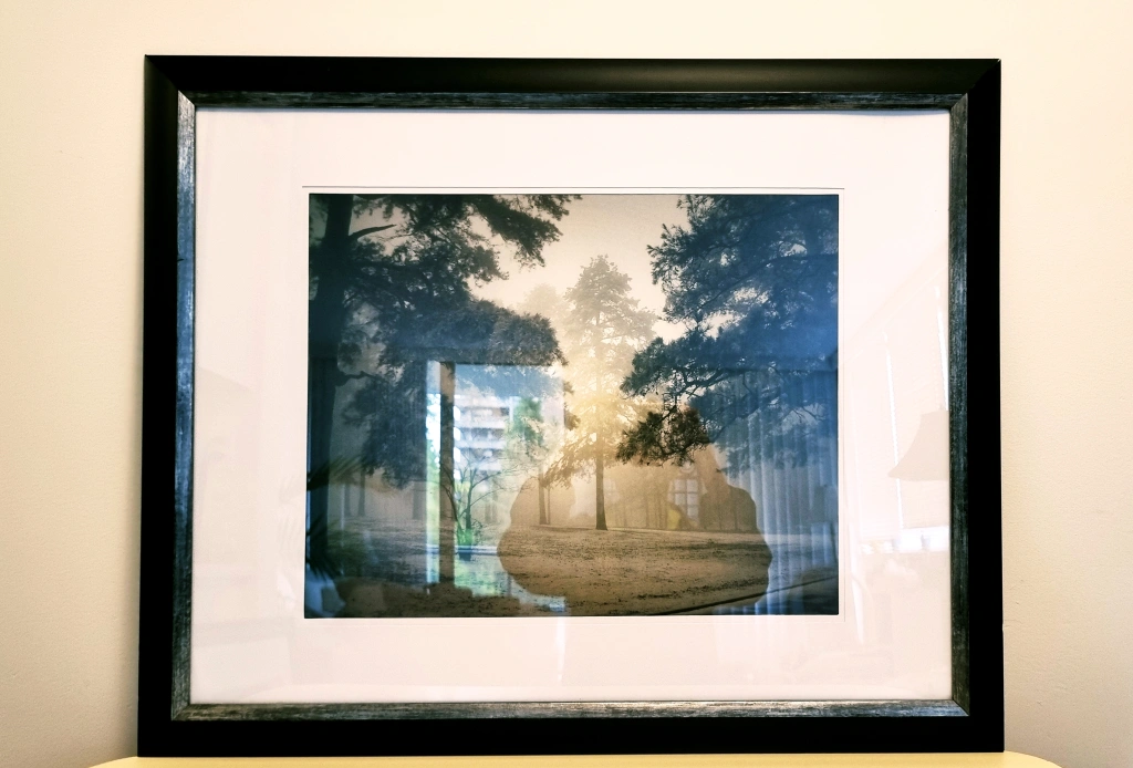 43Framed photograph of foggy trees. Black frame with silver trim.