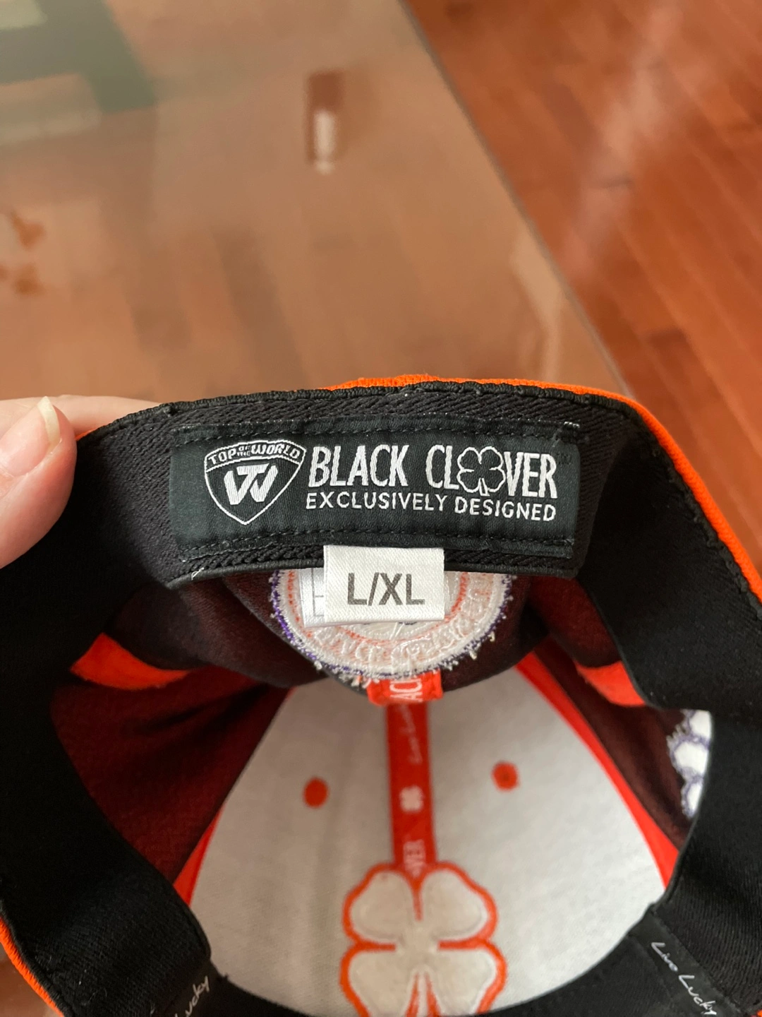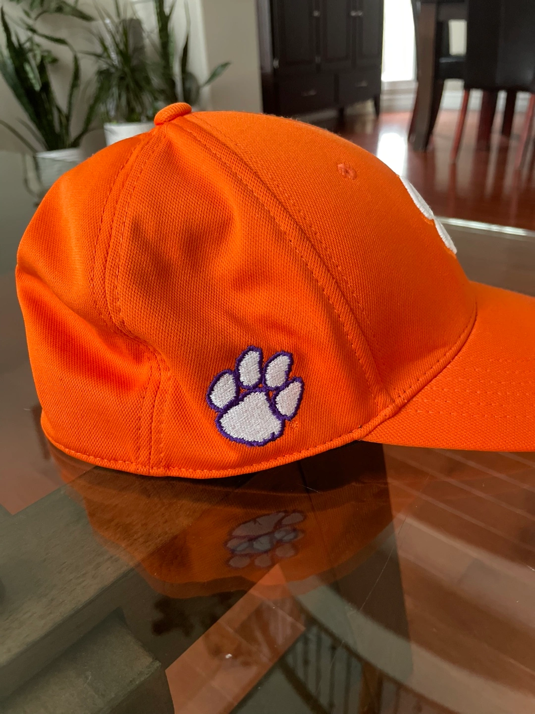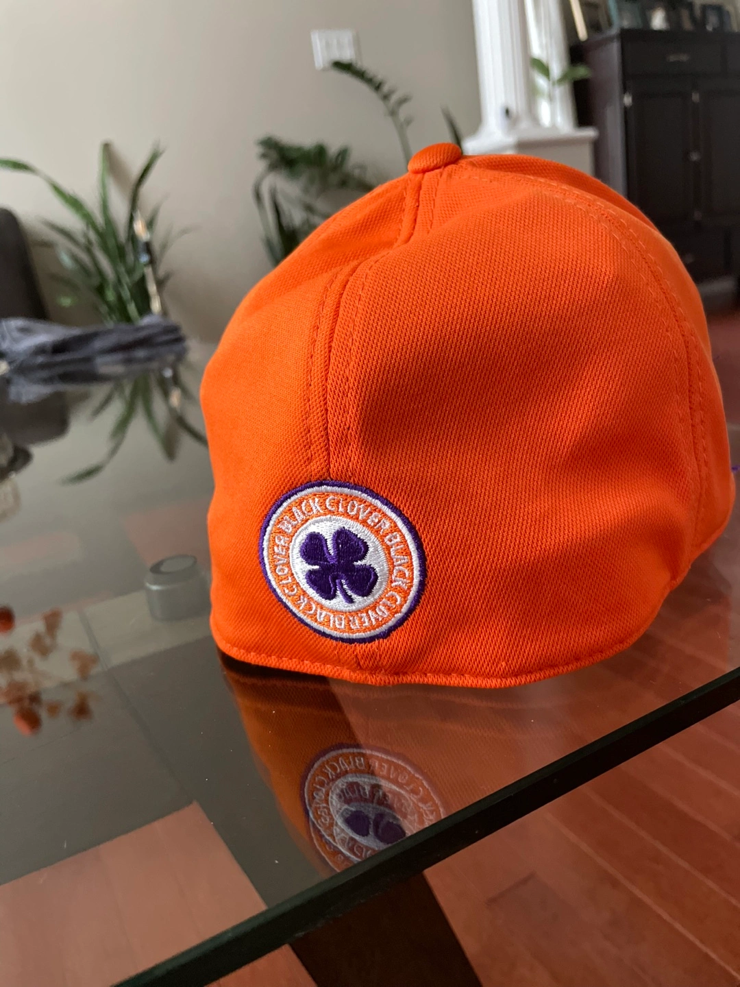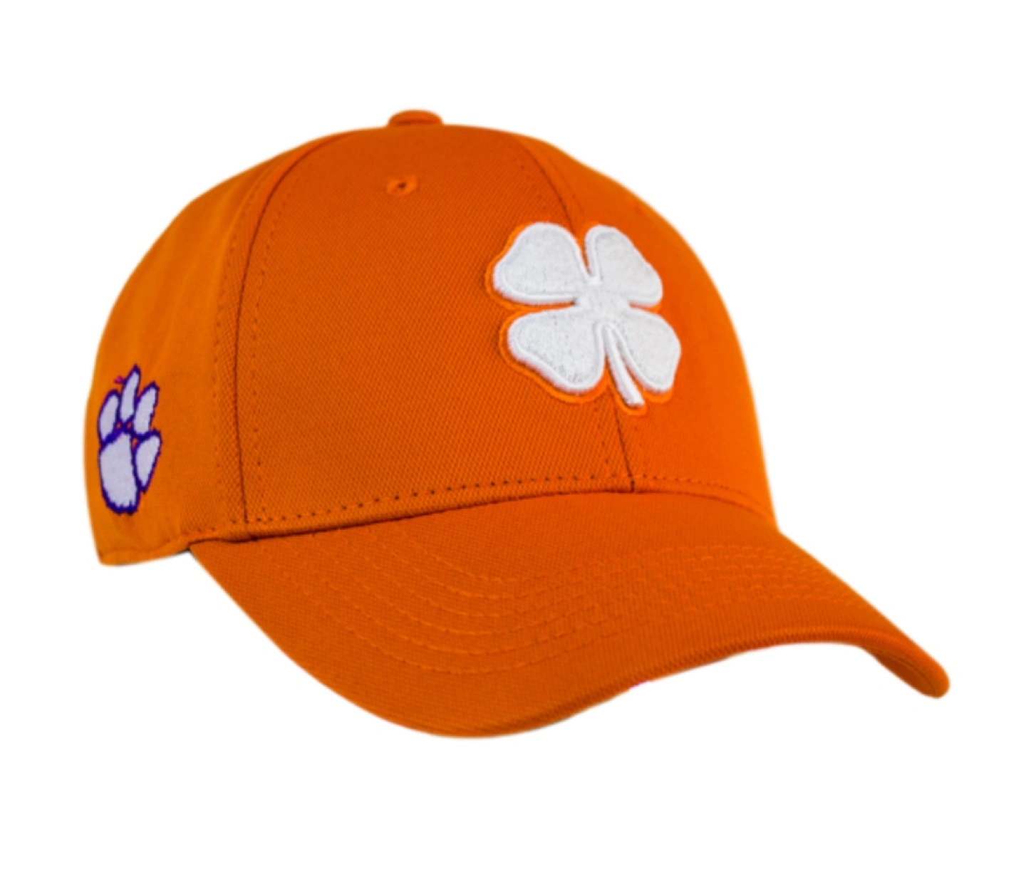 Black Clover premium golf hat in orange. Fitted style in L/XL. Clemson Tigers paw on one side.