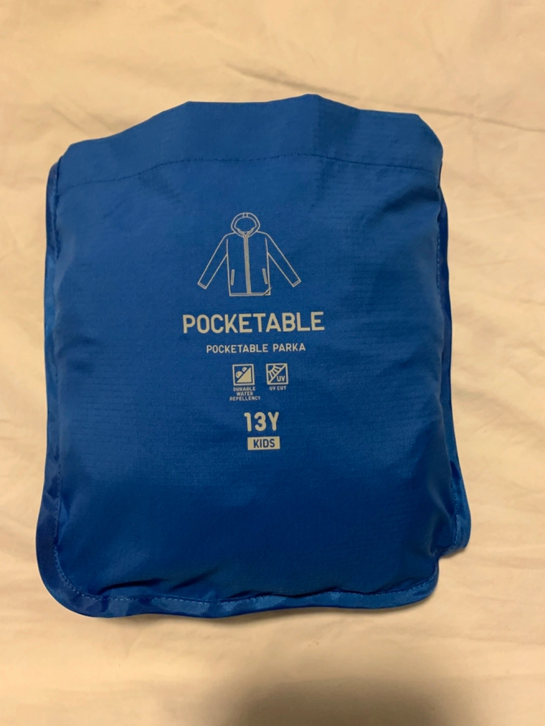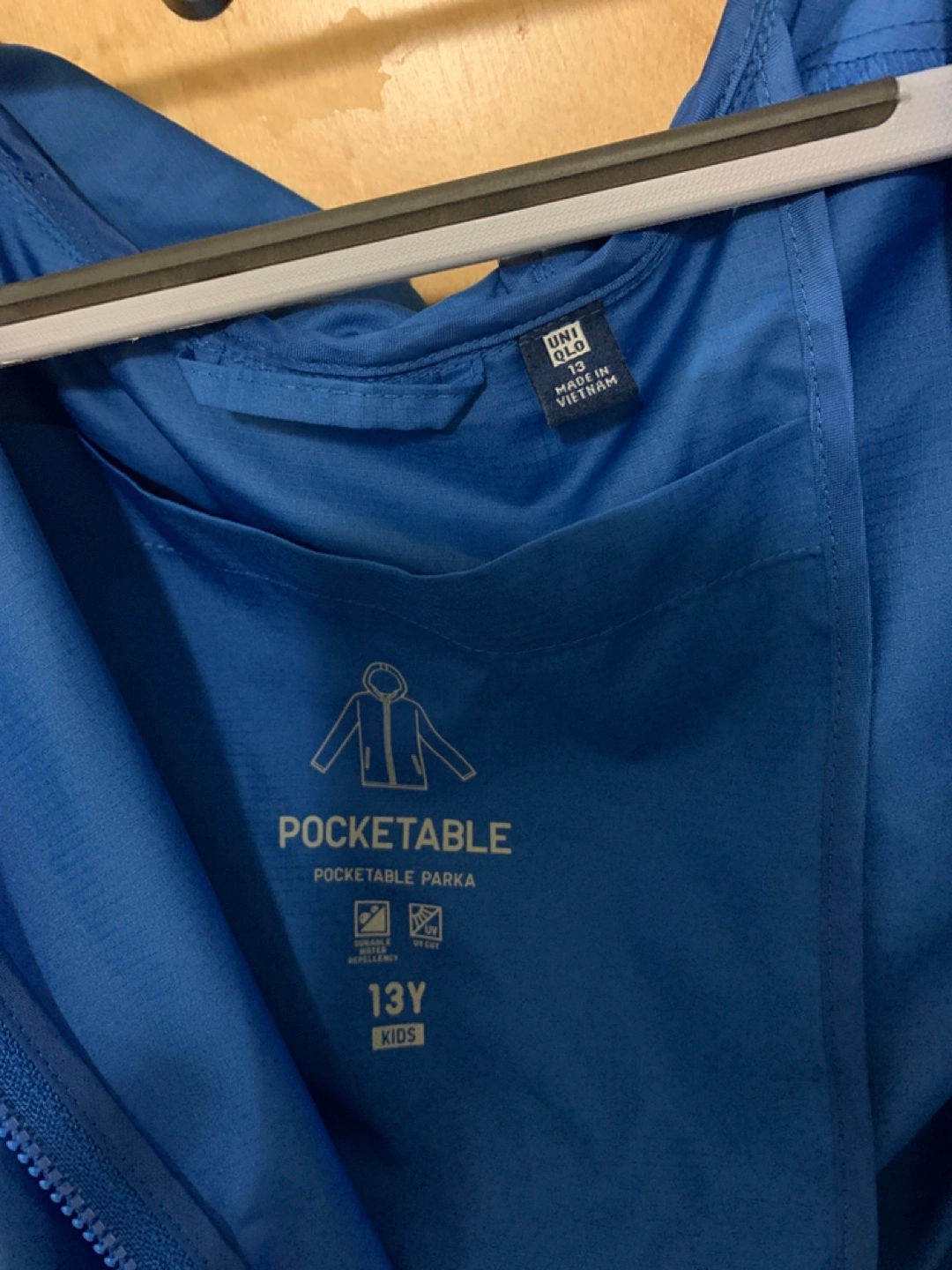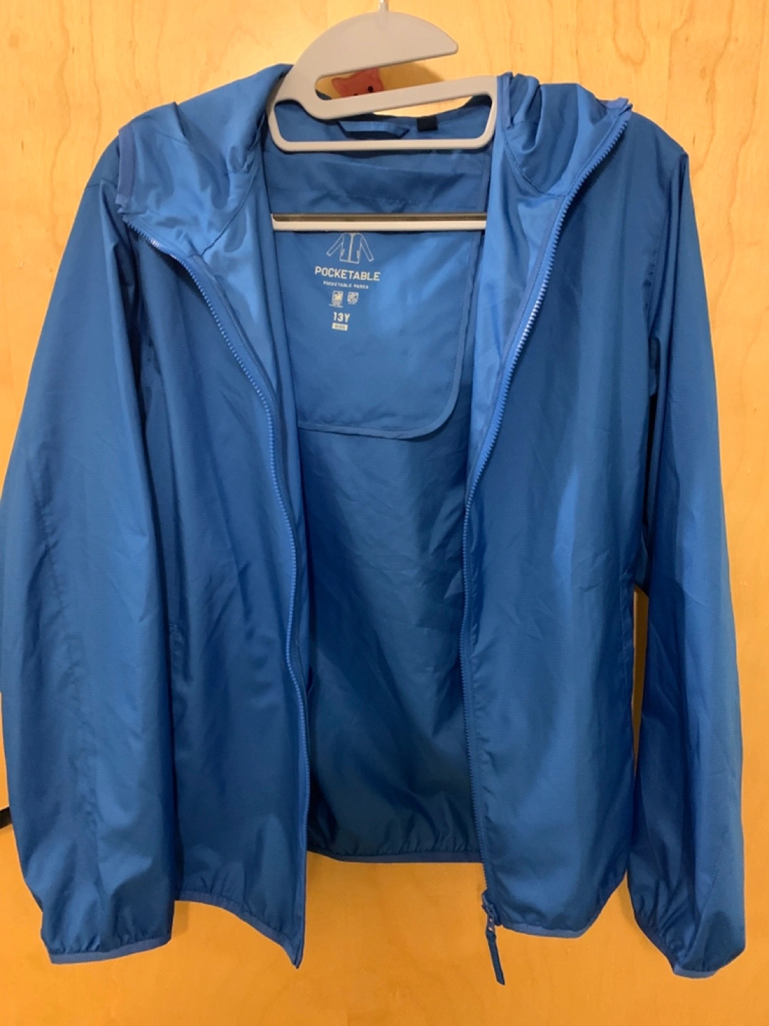 UNIQLO Kids blue jacket, size 13Y, with a hood and zipper closure. It has pockets and is made of a lightweight material.