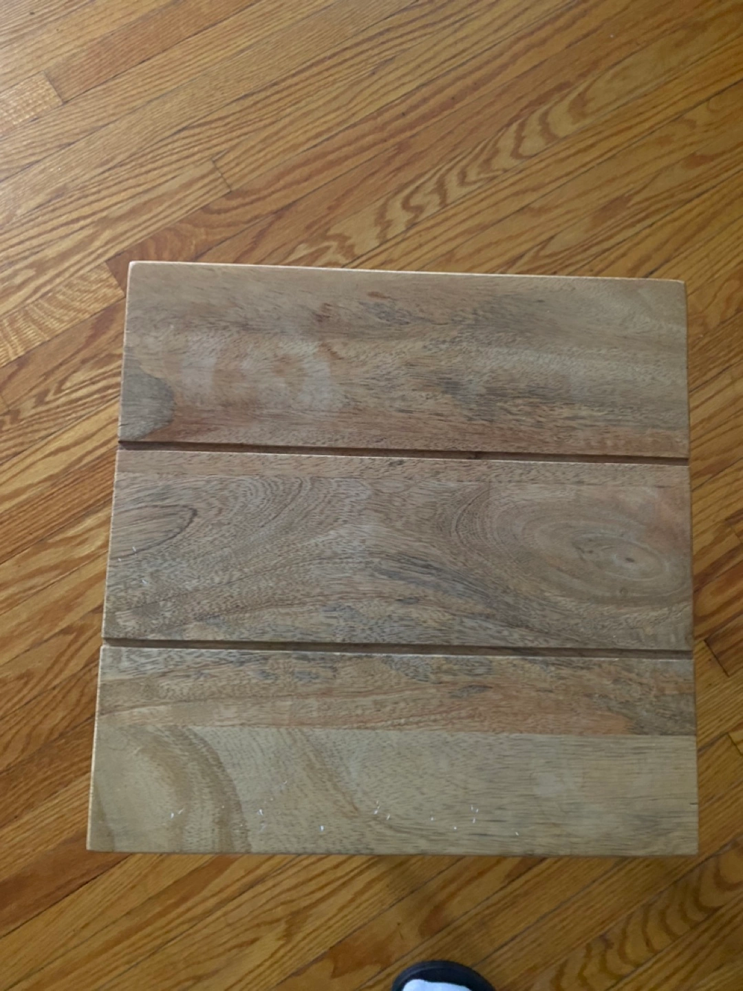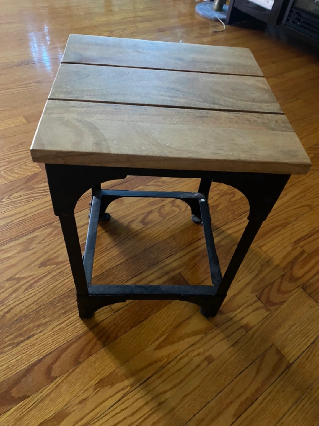 Small square wooden table with black metal legs. Great for a small space.