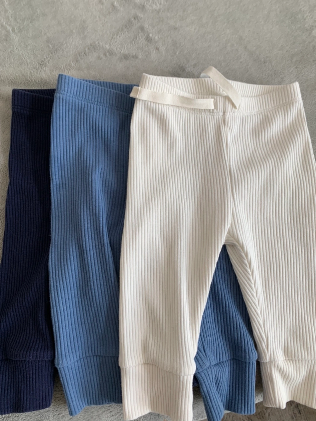 160Three pairs of ribbed leggings. One pair in navy blue, one in light blue, and one in cream. All pairs are stretchy and comfortable, my son outgrew super quick so they have only been worn 1-2 times