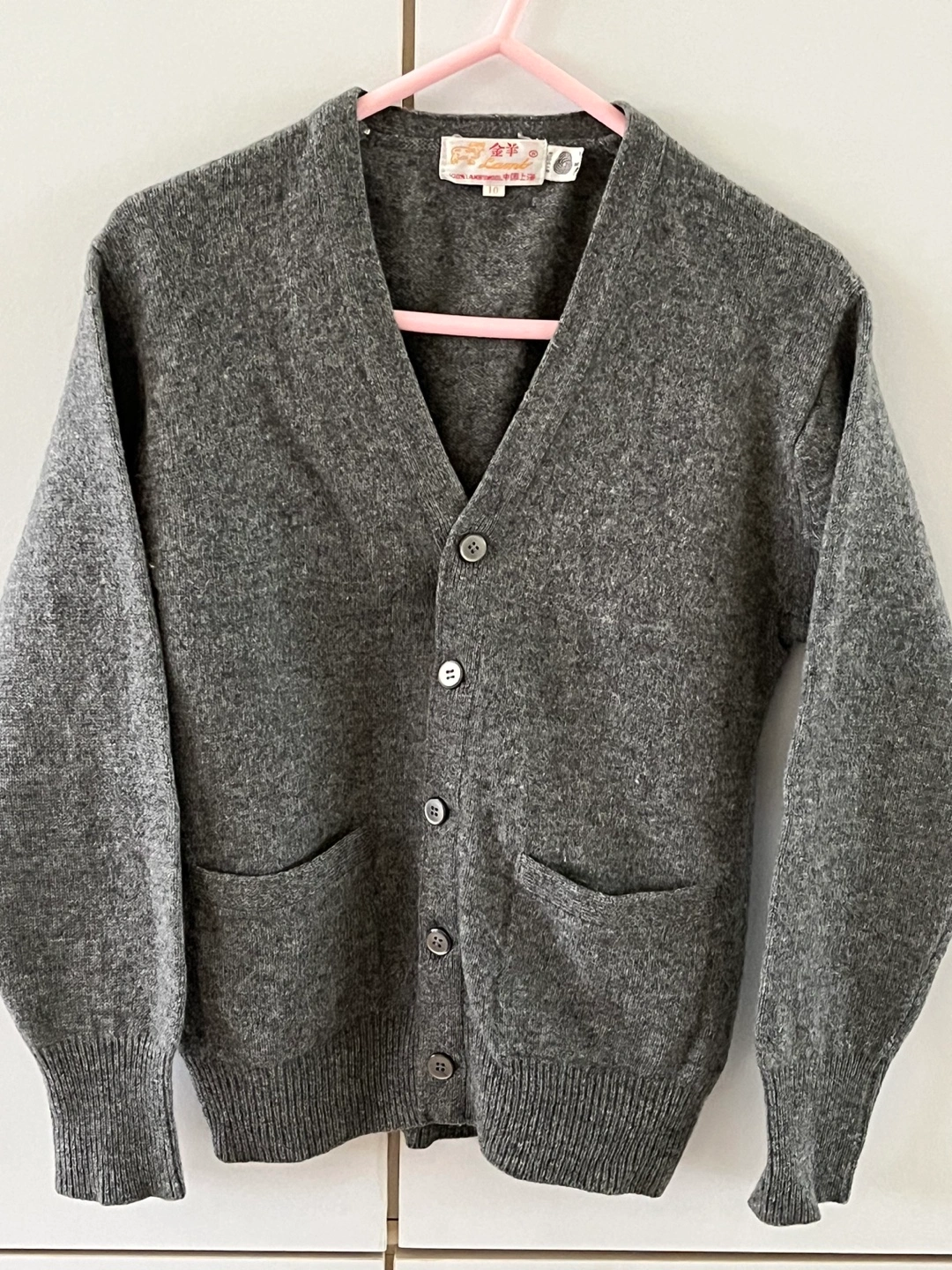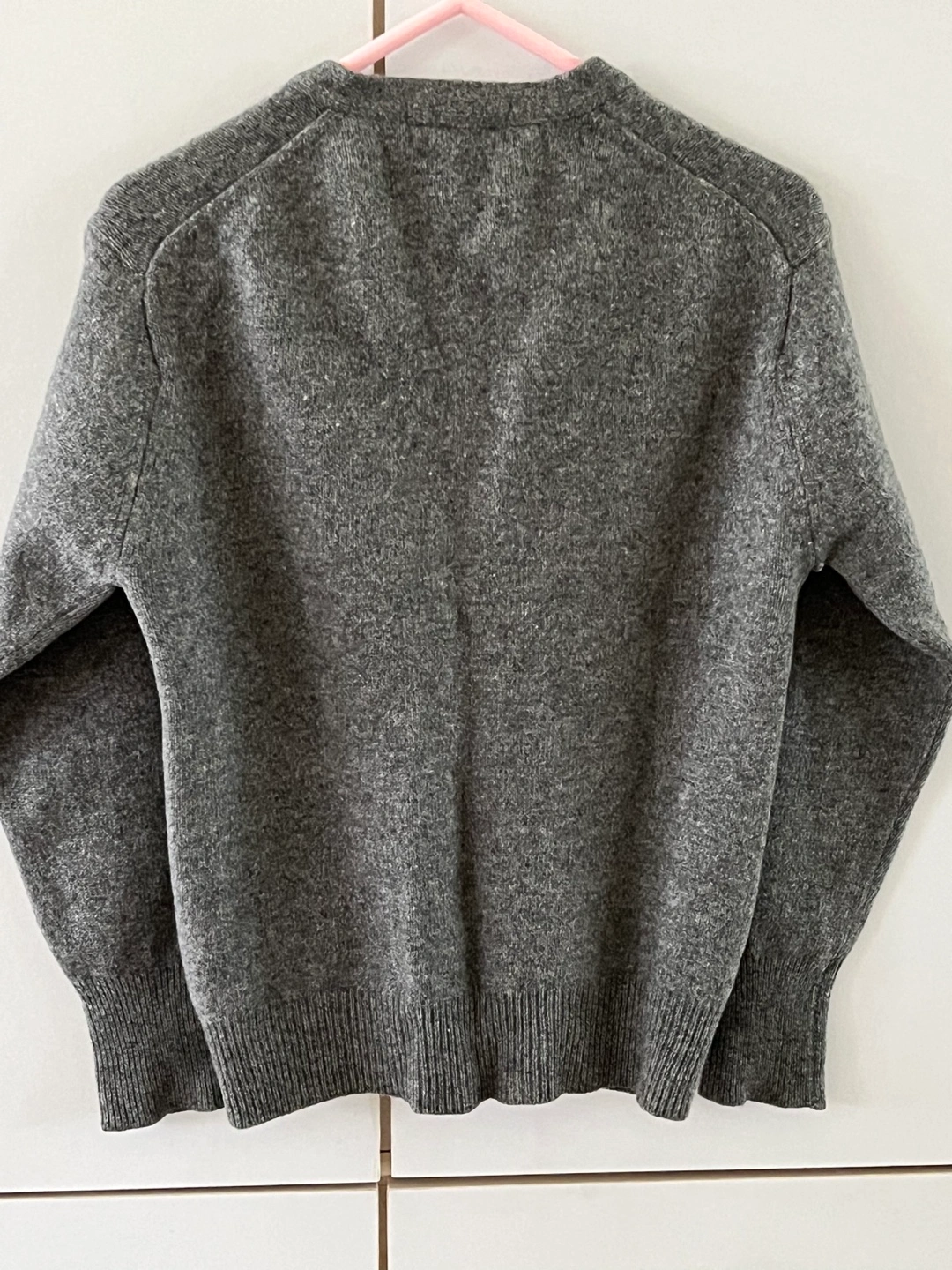 Grey wool cardigan with long sleeves, a v-neck, button closure, and two pockets. 100% pure new wool. Size 10. In good condition.