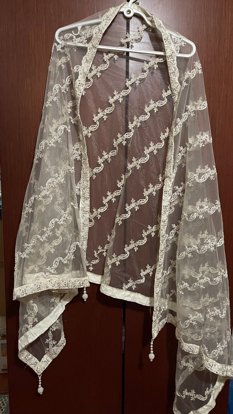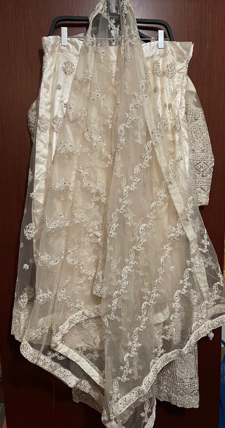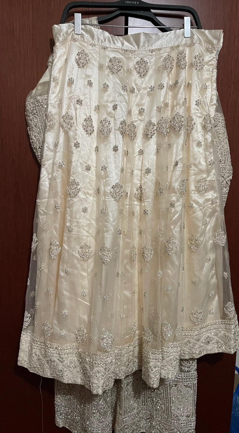 Brand new, never worn Beautiful off-white Indian party dress. Includes a top, skirt, and dupatta. Embroidered and beaded throughout. Looks even better in person.
