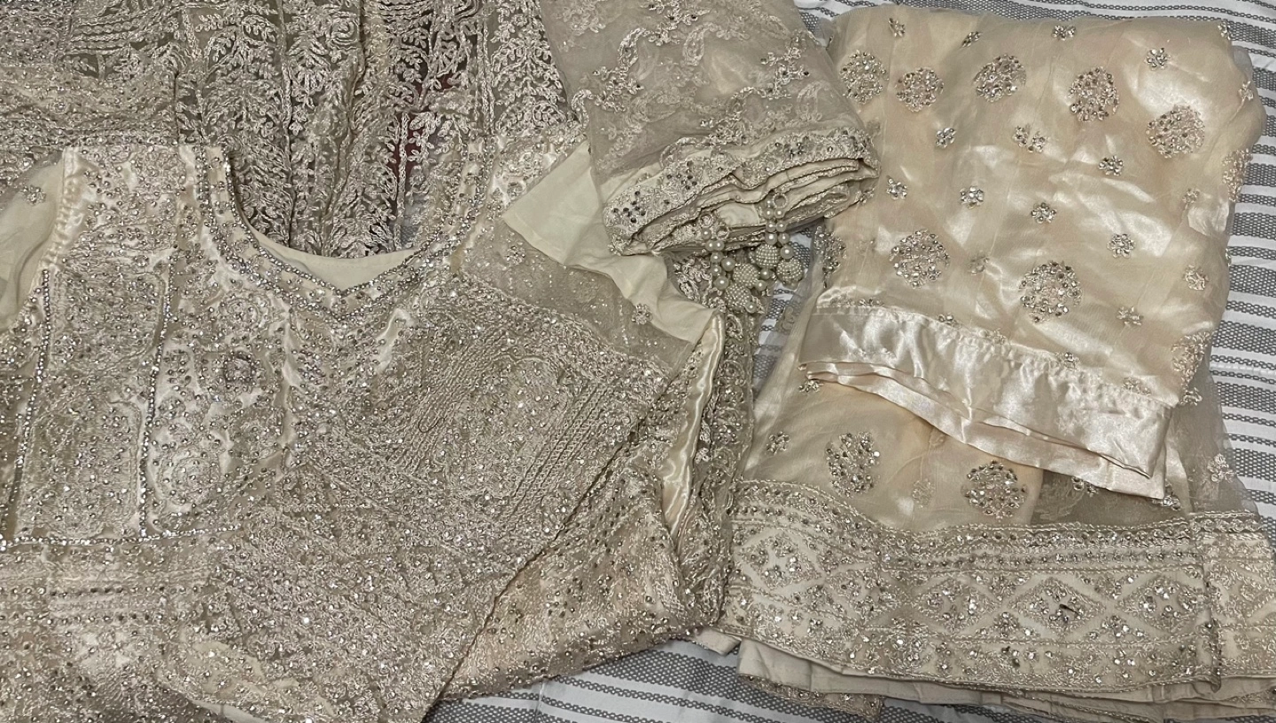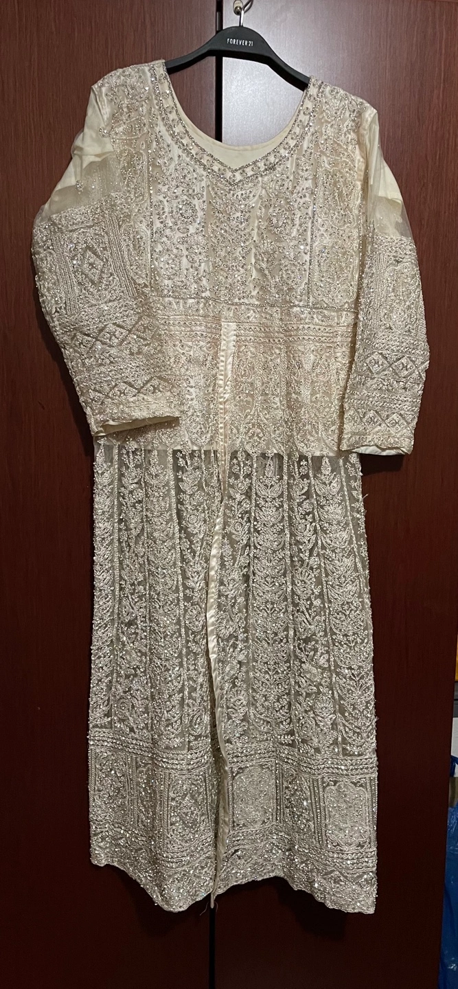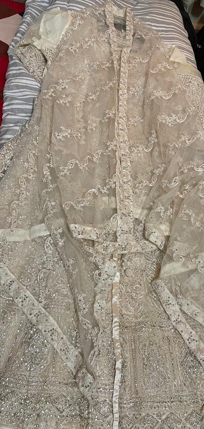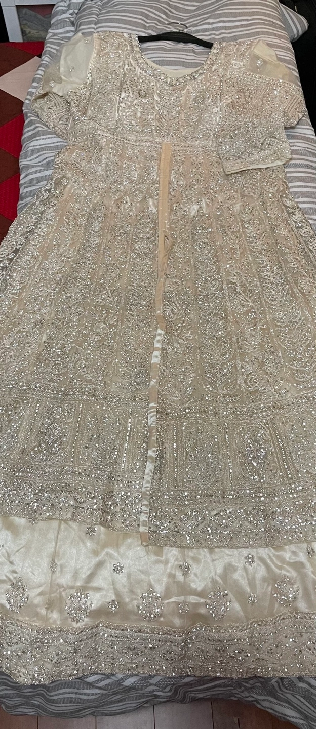 Brand new, never worn Beautiful off-white Indian party dress. Includes a top, skirt, and dupatta. Embroidered and beaded throughout. Looks even better in person.
