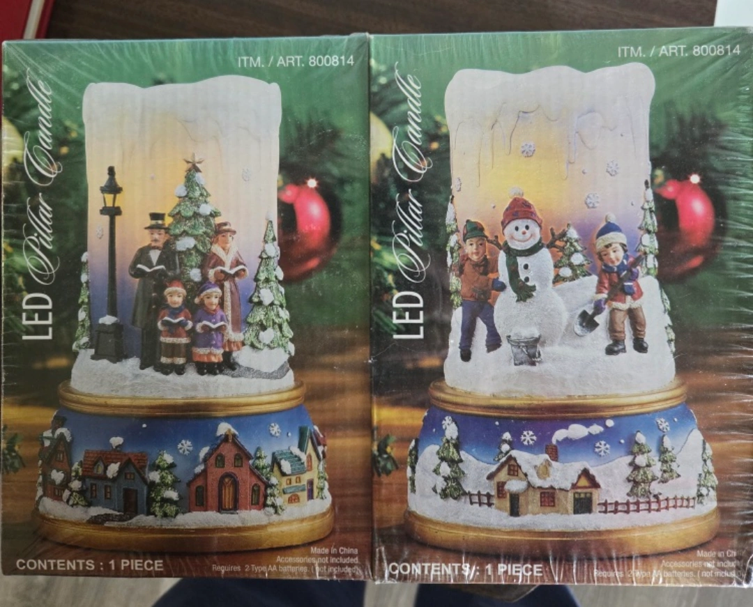 Two Christmas themed LED pillar candles, each with a different scene. Realistic flame effect. Crafted and painted by hand. Indoor decorative use only. Requires 2 AA batteries (not included). Brand new. Never been opened