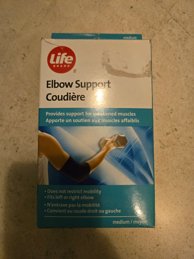 Provides support for weakened muscles. Fits left or right elbow. Does not restrict mobility. Medium size. Tried on but too big for me. Accepting cash offers or will trade for same/ similar in Small or XS (or other things I need more)