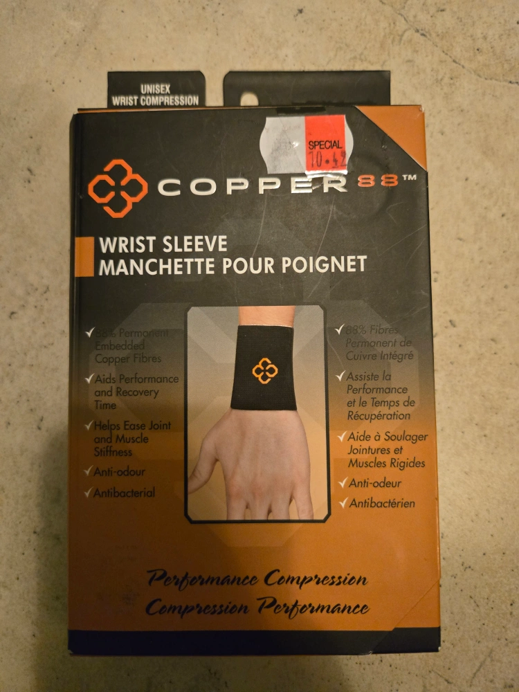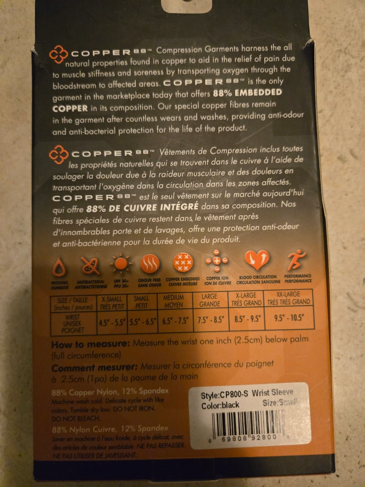 Unisex wrist compression sleeve. Performance compression. Embedded Copper Fibres. Small size.
