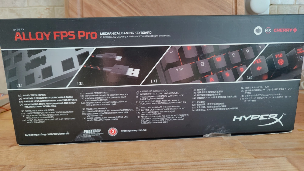 Mechanical gaming keyboard with Cherry MX Red switches. Features a solid steel frame, detachable cable, and RGB lighting effects. Comes with a keycap puller and original cable.