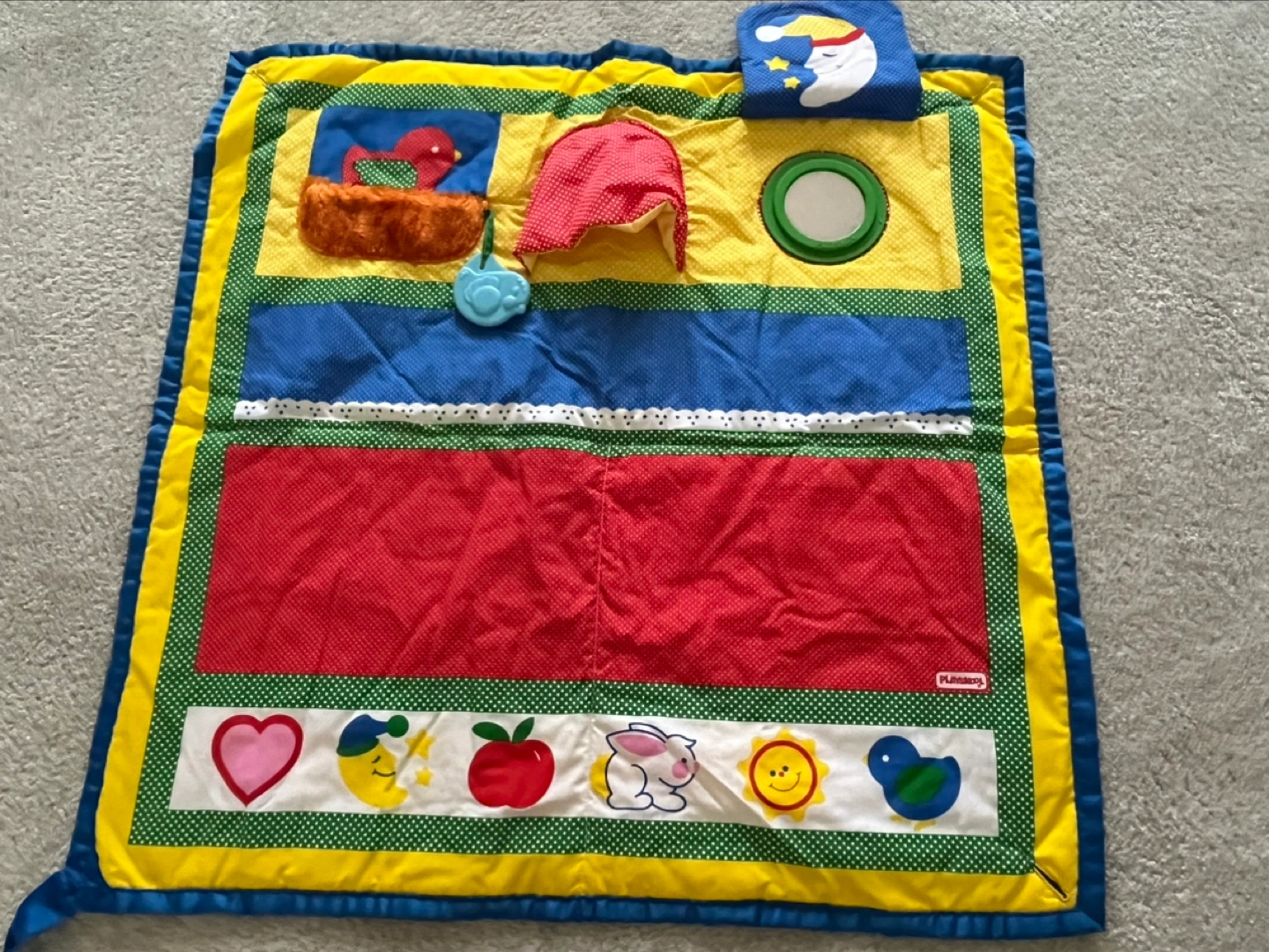Playskool playmat with activity features including a mirror, a crinkle sound, and a pocket with a stuffed bird. Great for tummy time or play. It’s foldable and easy to carry. Good condition and clean.