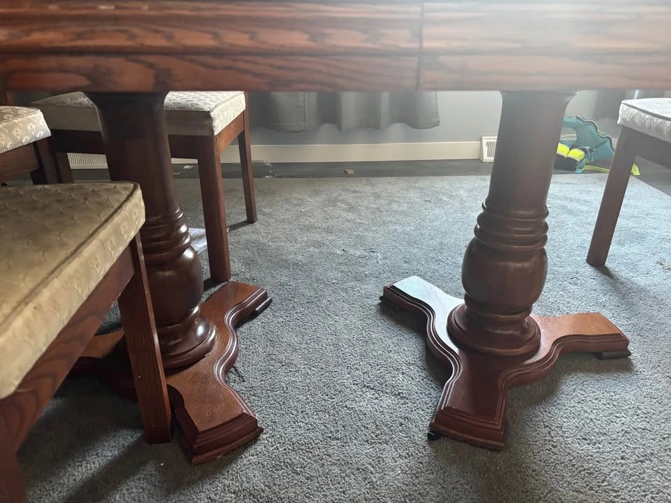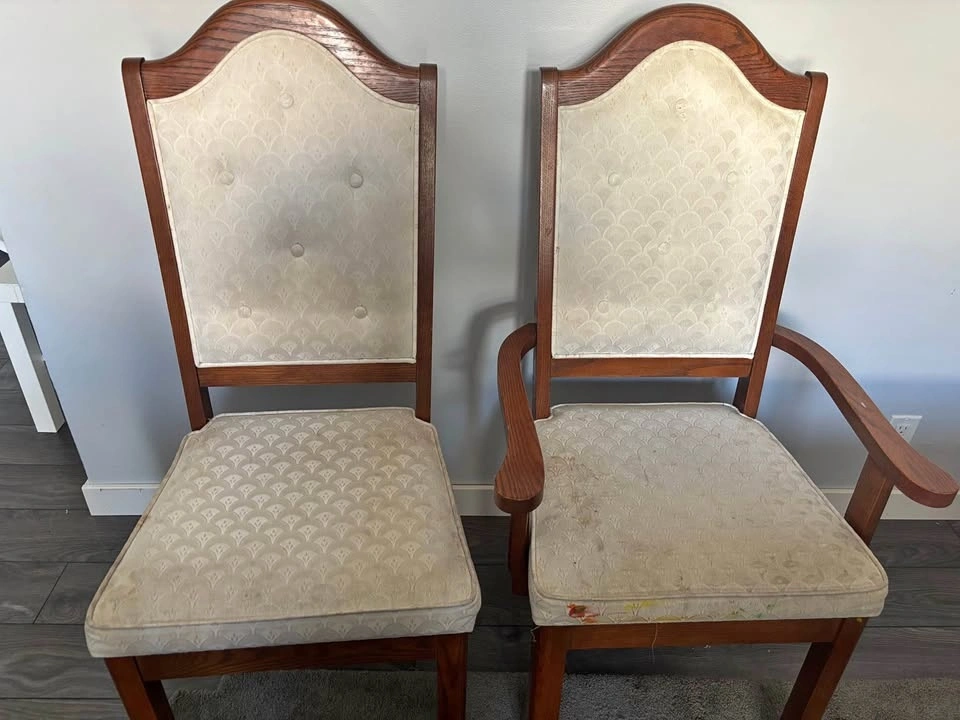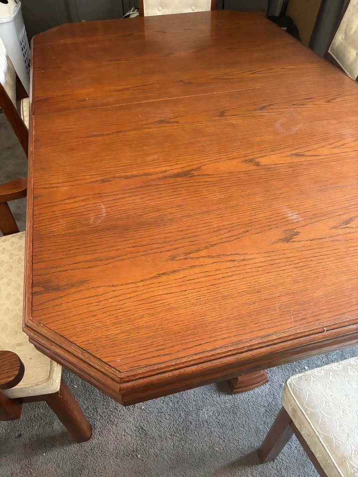 This dining room table and chairs set is great for large family gatherings. The fabric on the chairs needs to be cleaned and painted, but other than that, the table and chairs are in pretty decent condition. Pick up only.