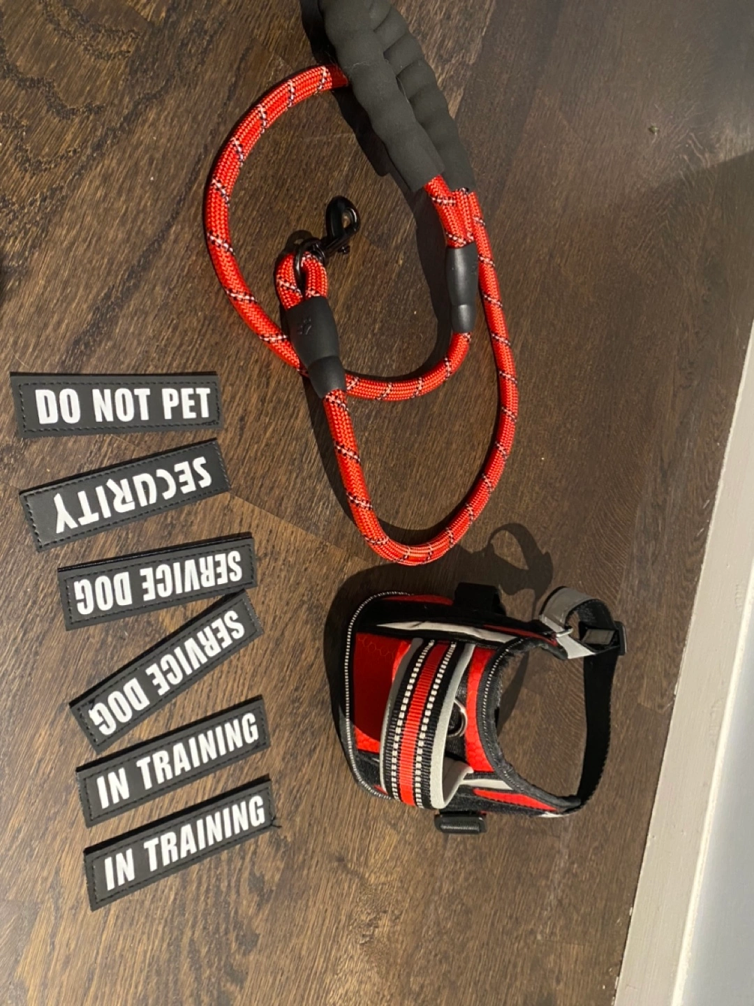 Animire brand Red dog harness and leash set with patches. Features a 360 degree rotating quick release hook, a comfortable padded handle, and reflective strips. Comes with patches that say: "Service Dog", "In Training", "Security", and "Do Not Pet".