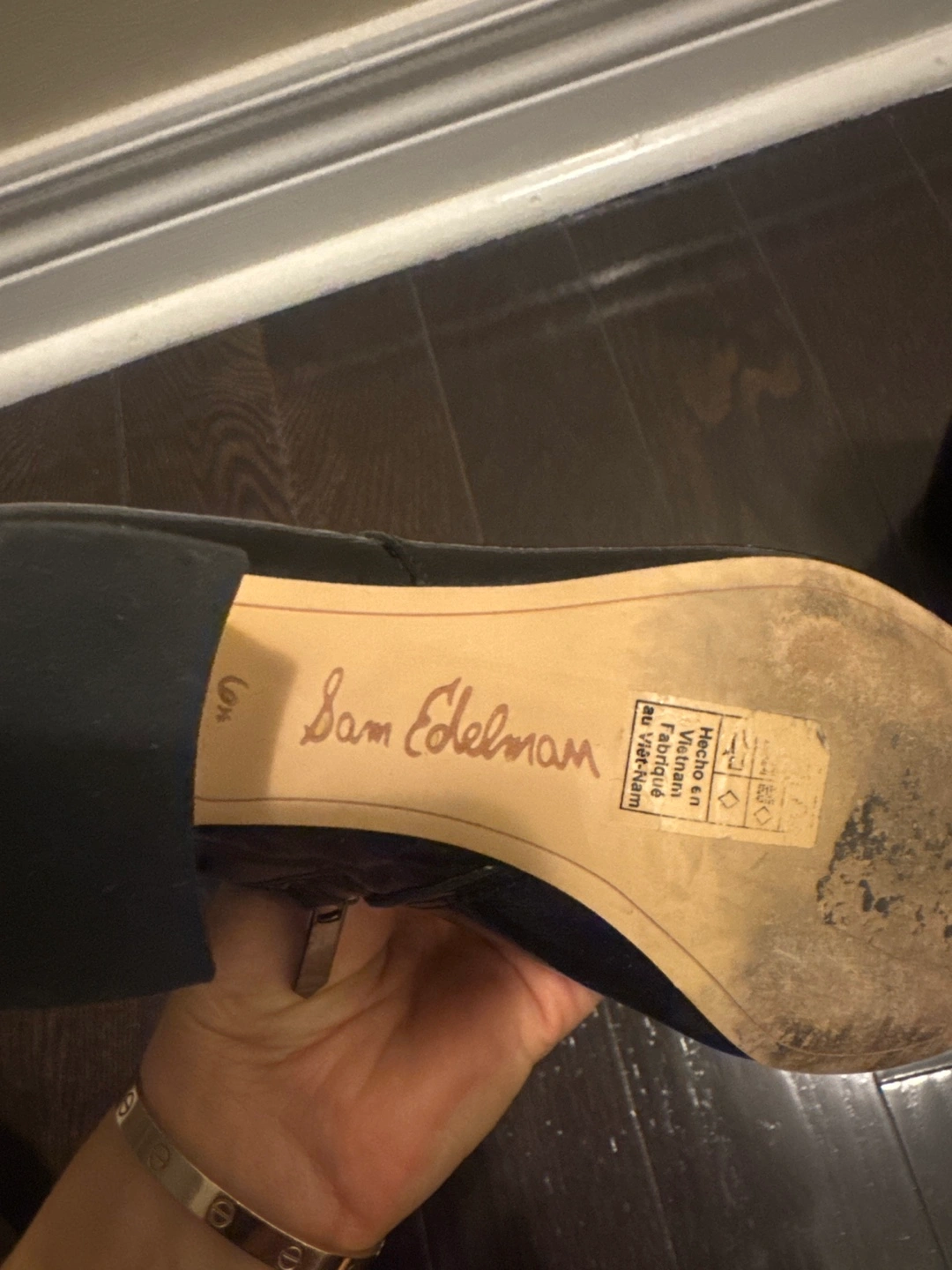 Black patent leather ankle boots with pointed toe and block heel. Side zipper closure.