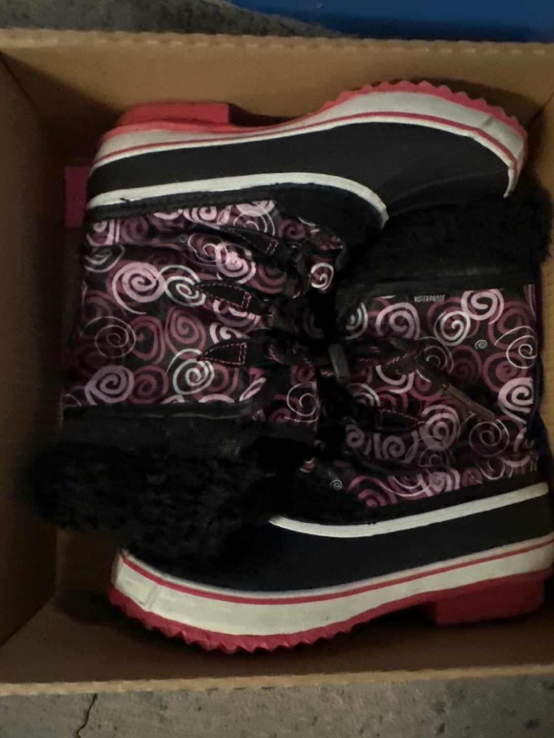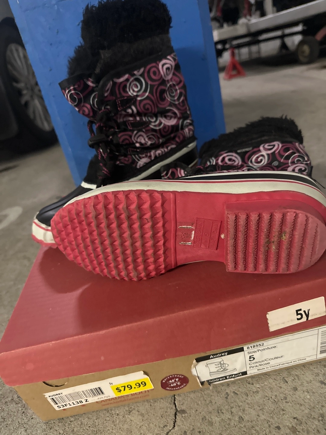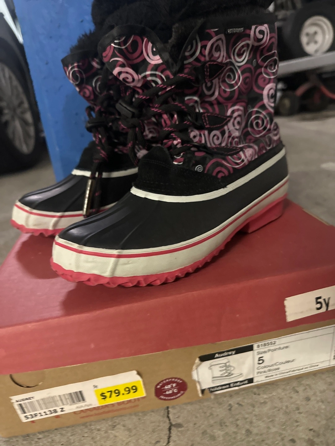 size 5 youth girls boots slightly used. Regular priced $79.99.plus tax. Used one winter. Color pink and black. Waterproof. Up to -40 Celsius coldness. Great in snow.