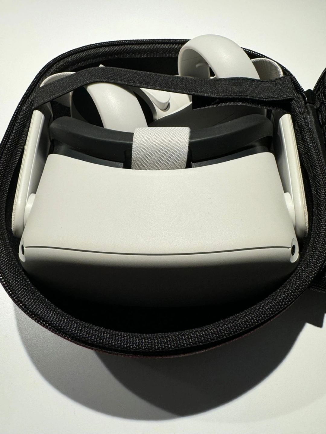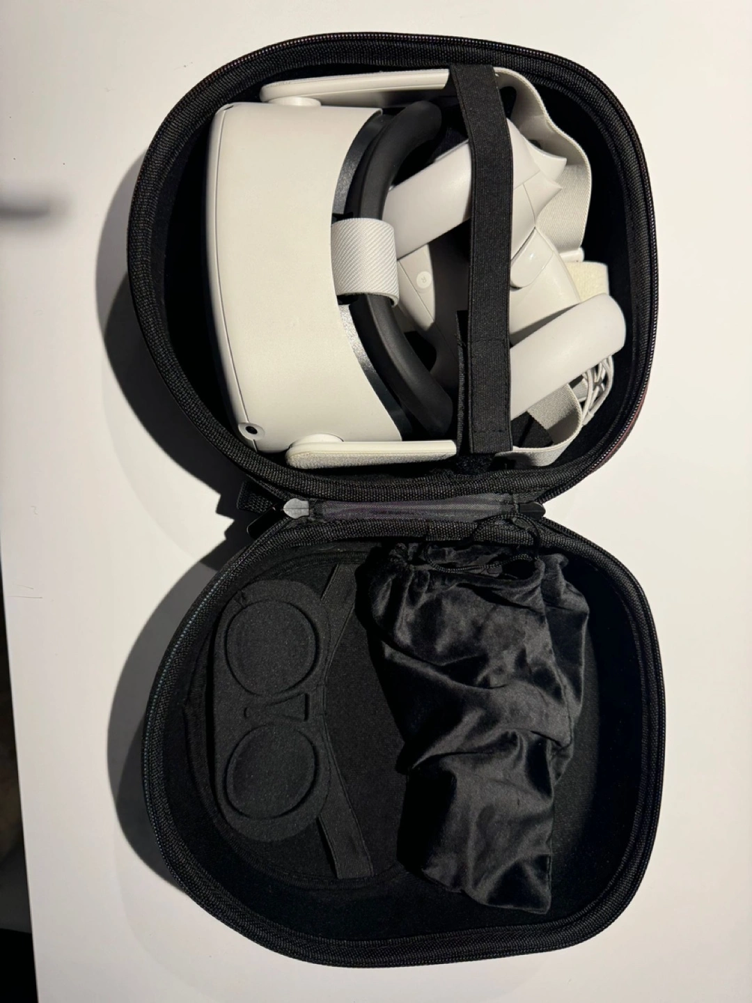 Oculus 2 VR headset with carrying case. Includes a soft pouch and lens covers.