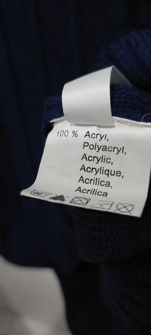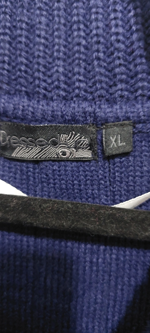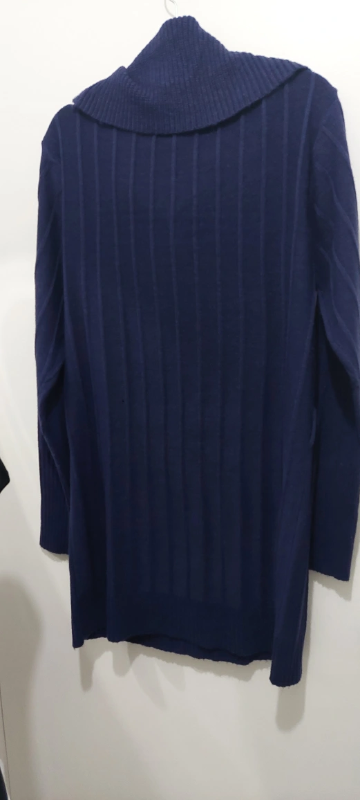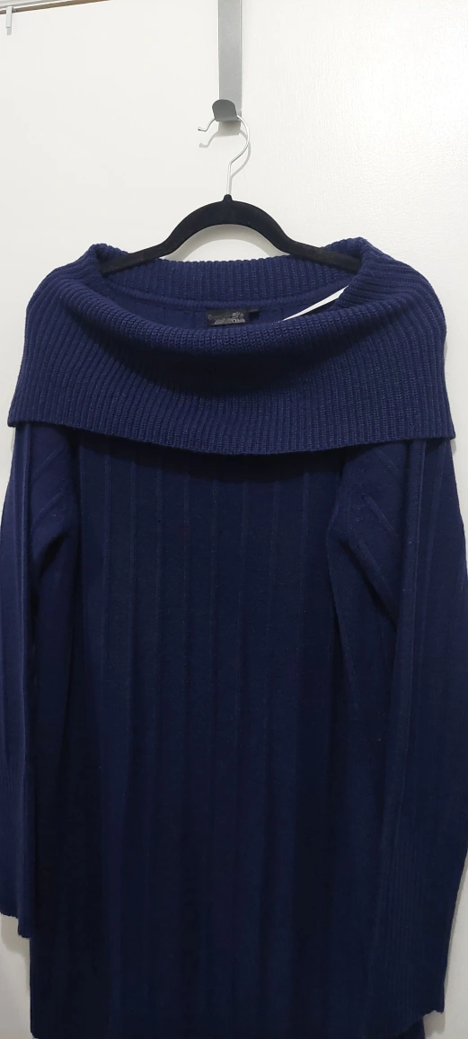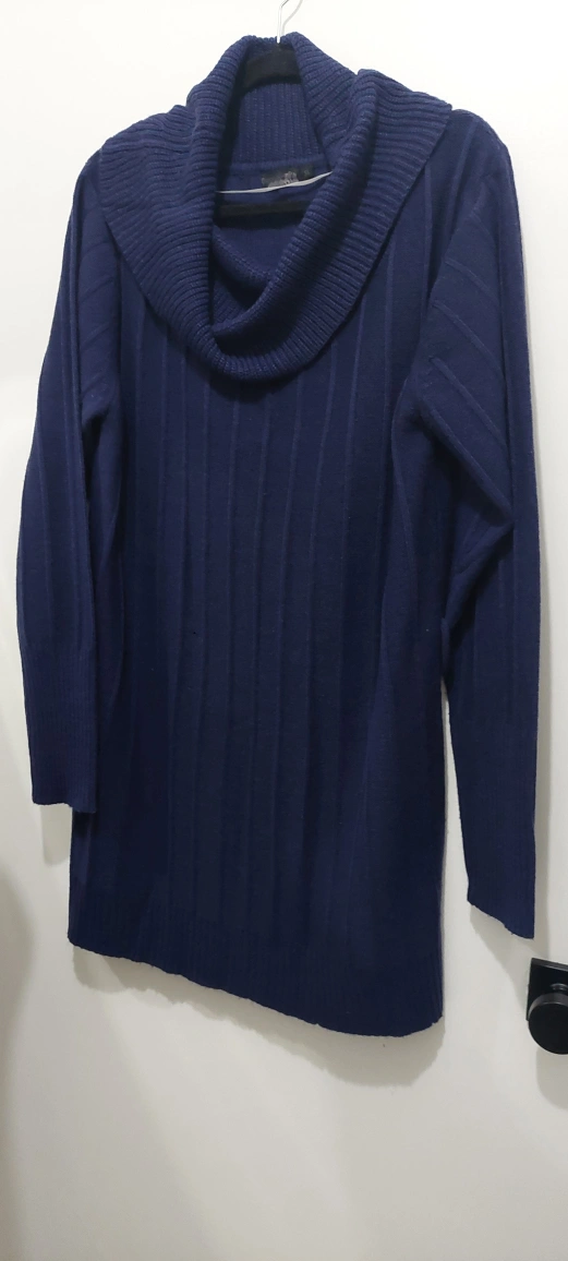 Long-sleeved, cowl neck sweater in navy blue. Made of 100% acrylic. Size XL.