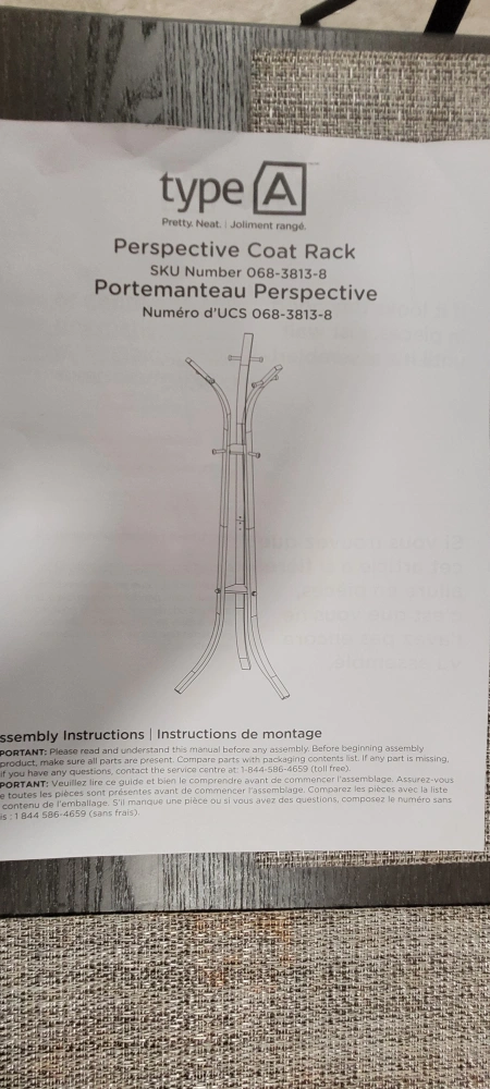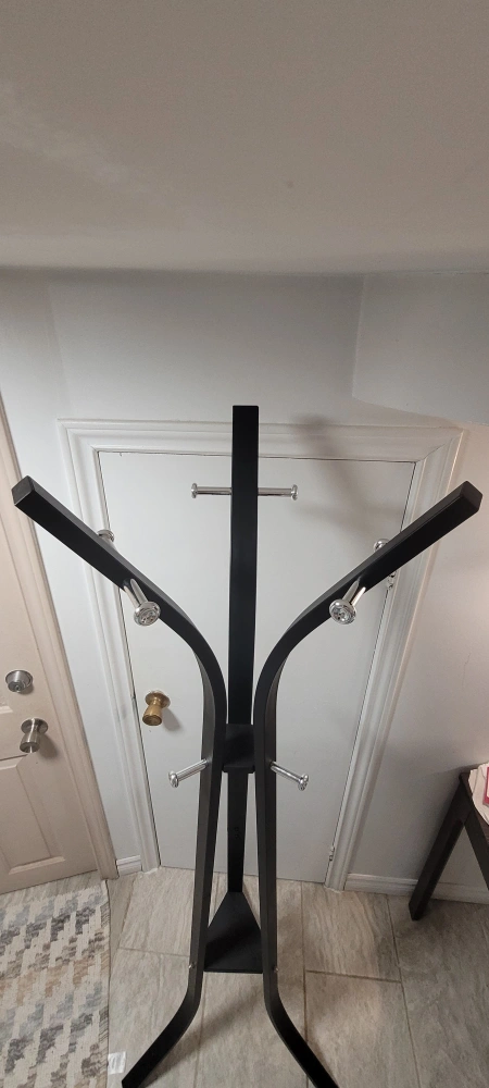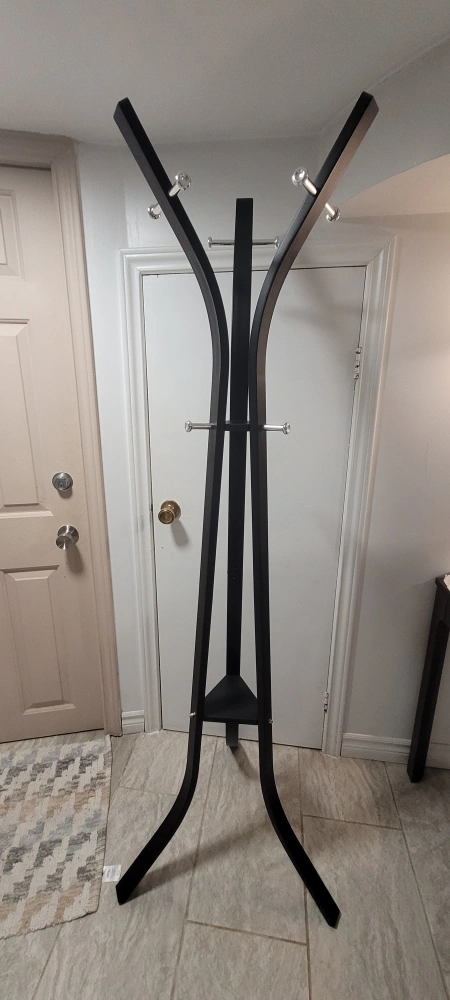 Black coat rack with chrome accents. Free standing and comes with instructions.