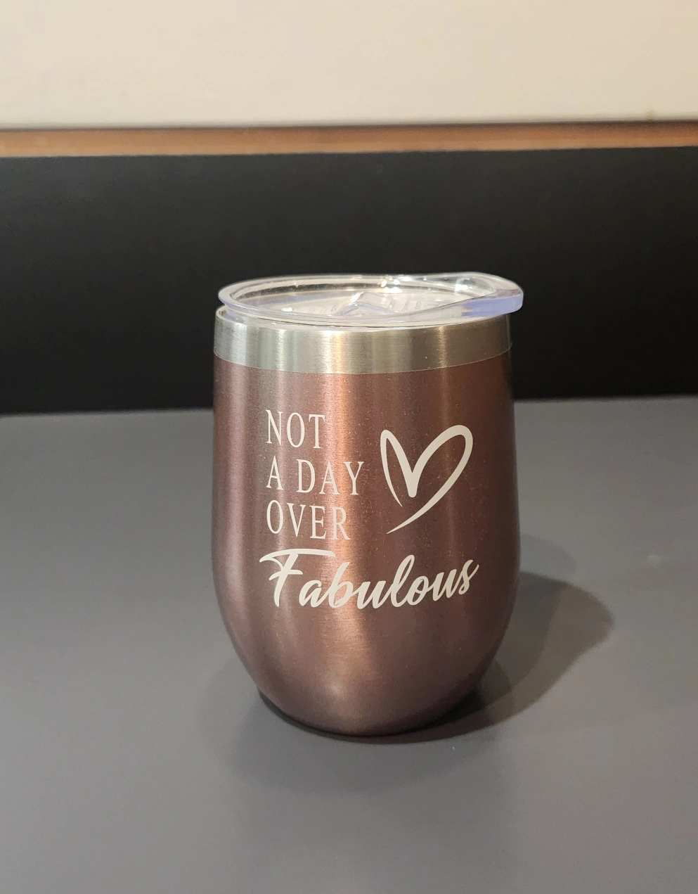 428Rose gold coloured stainless steel tumbler with a lid. Says "Not a day over fabulous".