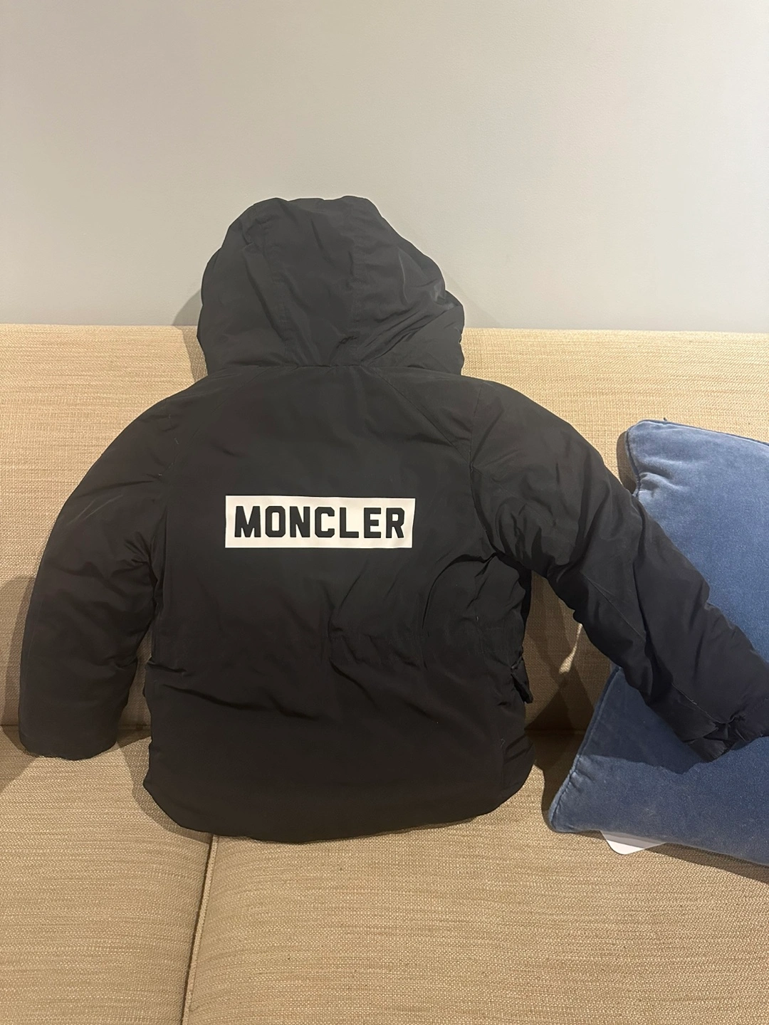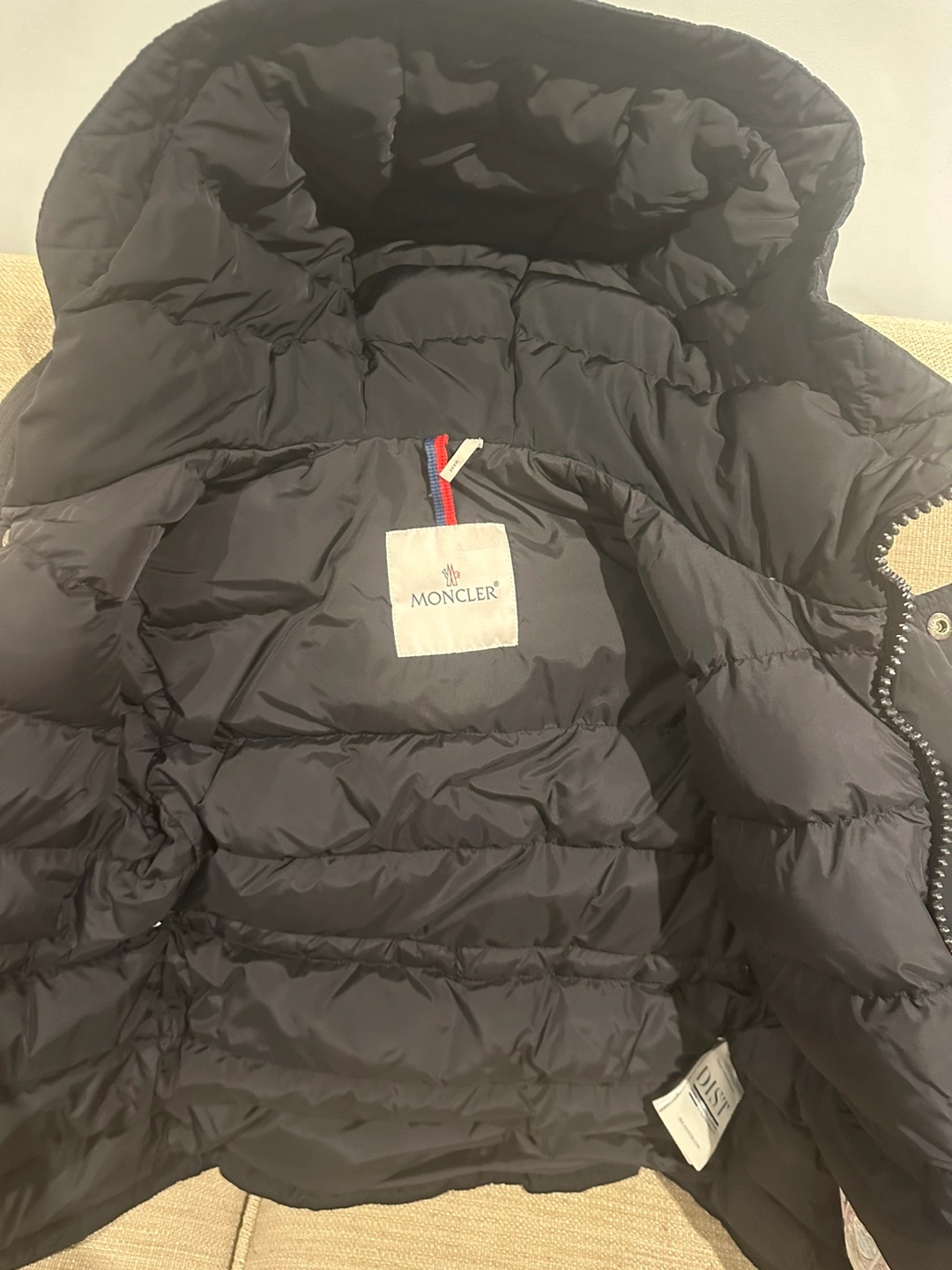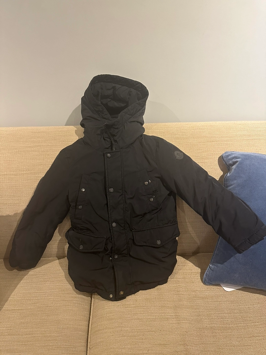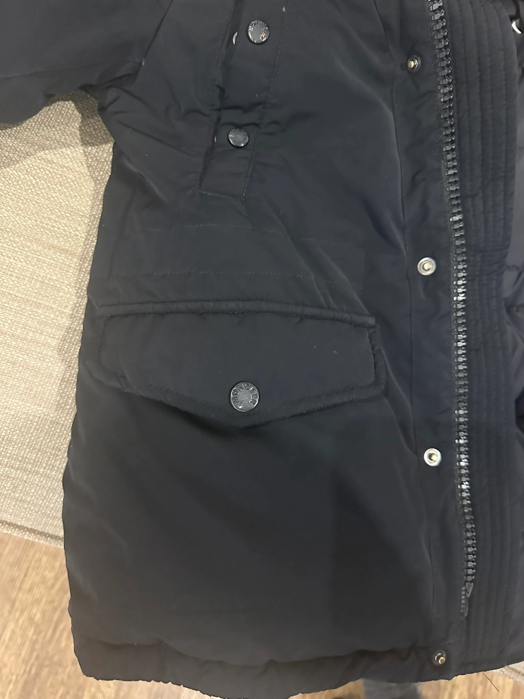 Black puffer jacket with a hood. Has two large front pockets, two smaller pockets and a logo patch on the arm. Size 8 years, 130cm. Fits well kids age 6-8. Paid $895+HST selling for $50. In good condition with some wear at the edge of sleeves and on metal buttons