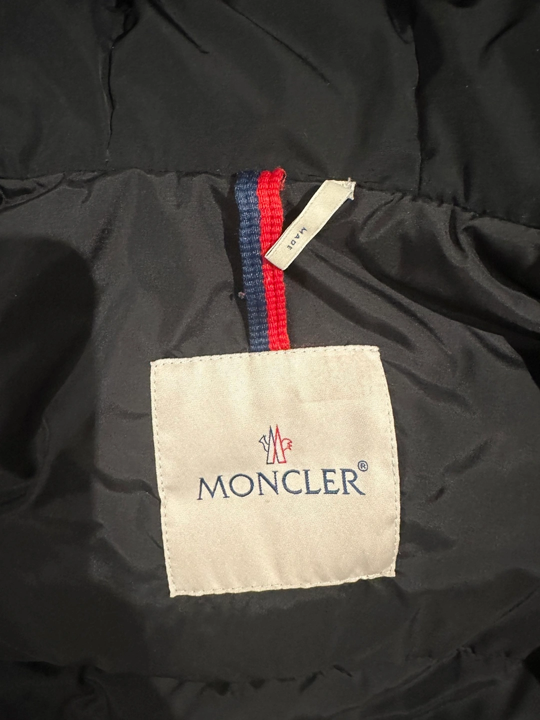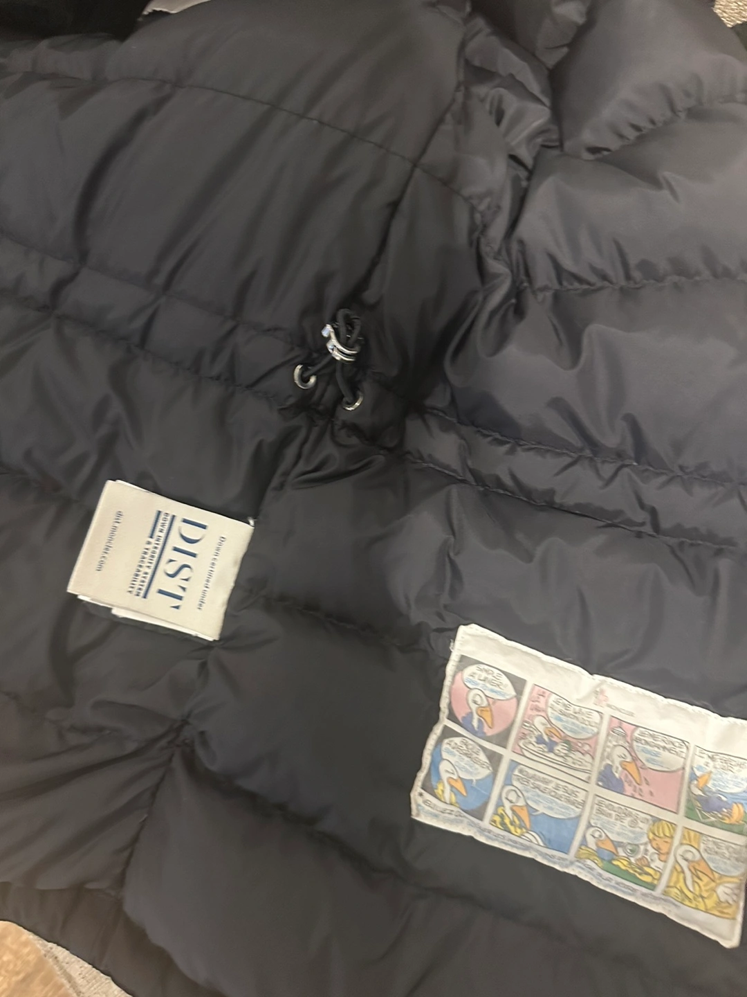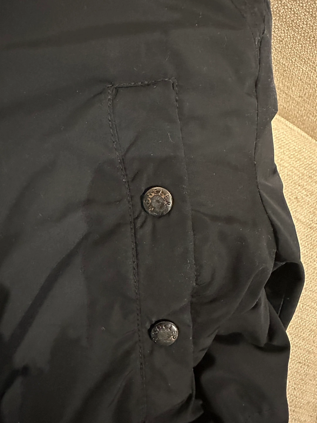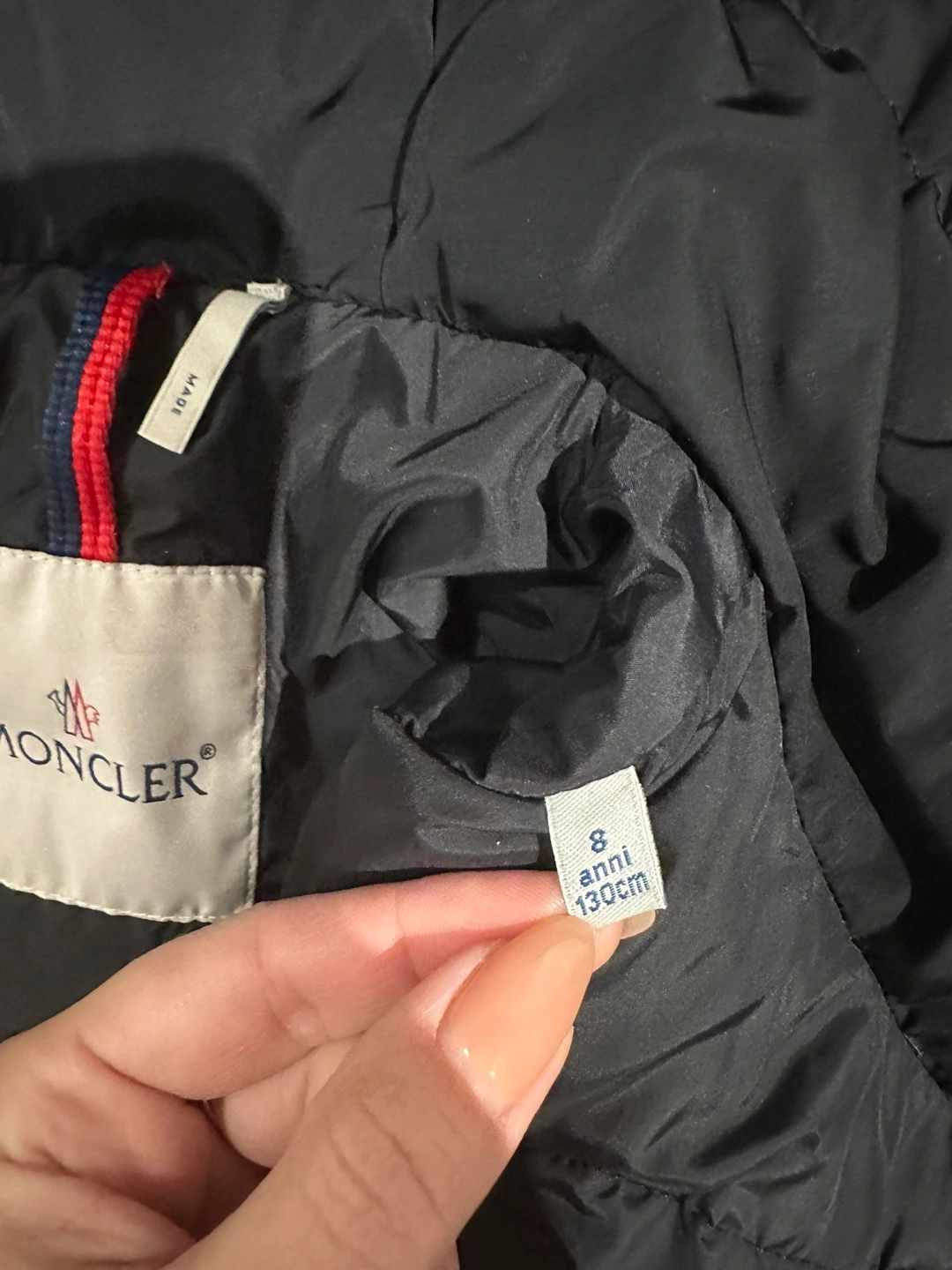 Black puffer jacket with a hood. Has two large front pockets, two smaller pockets and a logo patch on the arm. Size 8 years, 130cm. Fits well kids age 6-8. Paid $895+HST selling for $50. In good condition with some wear at the edge of sleeves and on metal buttons