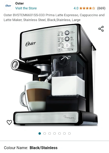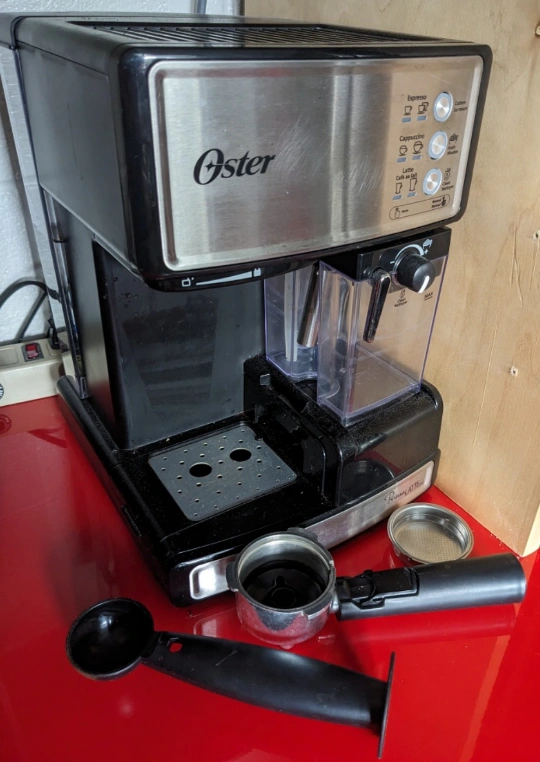 For sale: Semi-automatic Oster Prima Latte Espresso machine. 15 bar system. Makes a great espresso, double espresso, cappucino, and latte/café au lait. Comes with a single-cup portafilter, and dosing spoon with tamper on the back.