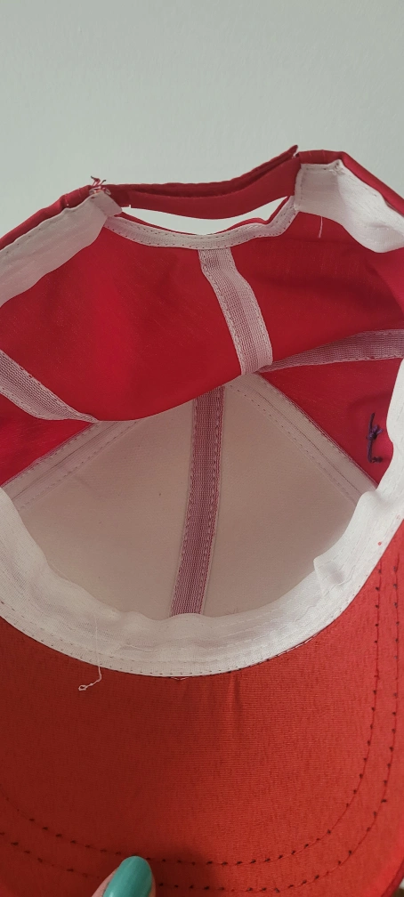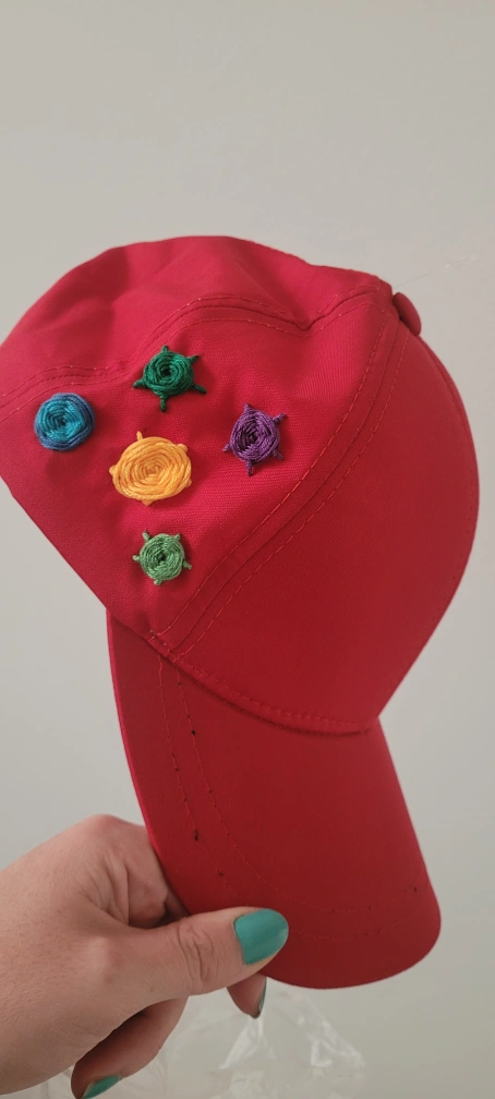 Red baseball cap with colorful embroidered flowers. Adjustable strap.