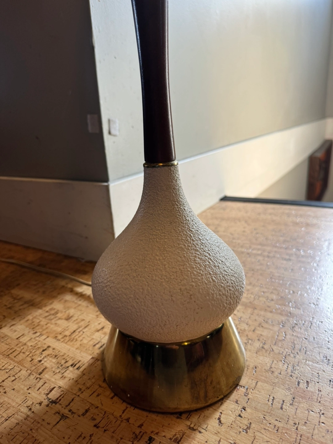 White ceramic lamp with a wooden stem and brass base. Includes a vintage fibreglass shade with a mid-century design.