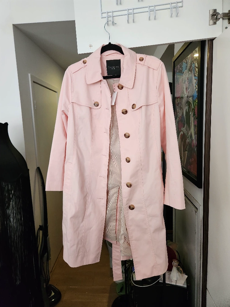 Talbots petite Pink trench coat with belt, long sleeves, and button closure. Made in the Philippines. Size Large, Still has price tag on coat