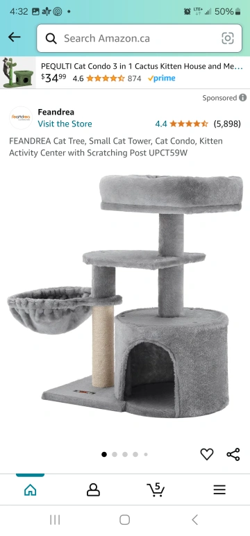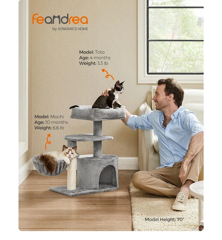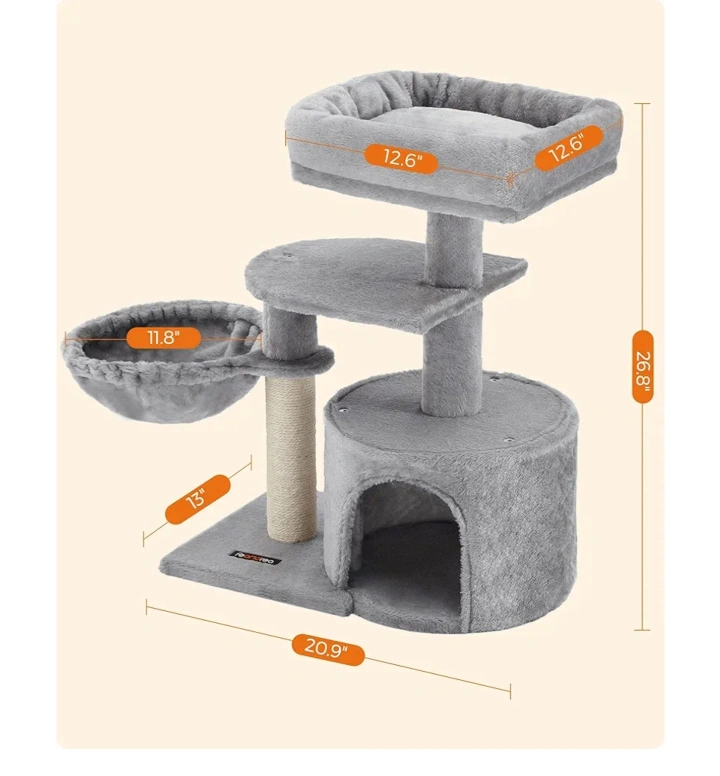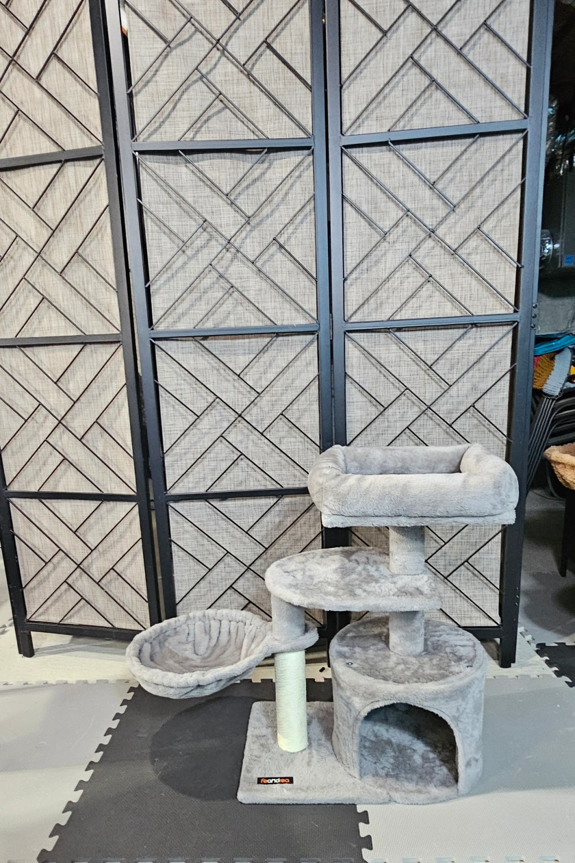 87Grey cat tree condo with scratching post, three levels, and a hammock.