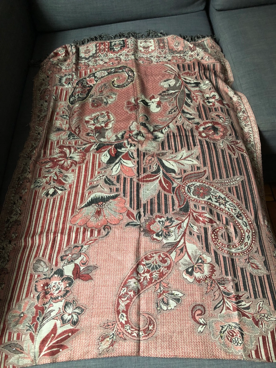 Dark red, black, and cream coloured scarf / shawl with intricate floral designs. Has rhinestones along the paisley design. Fringe detail along the bottom.