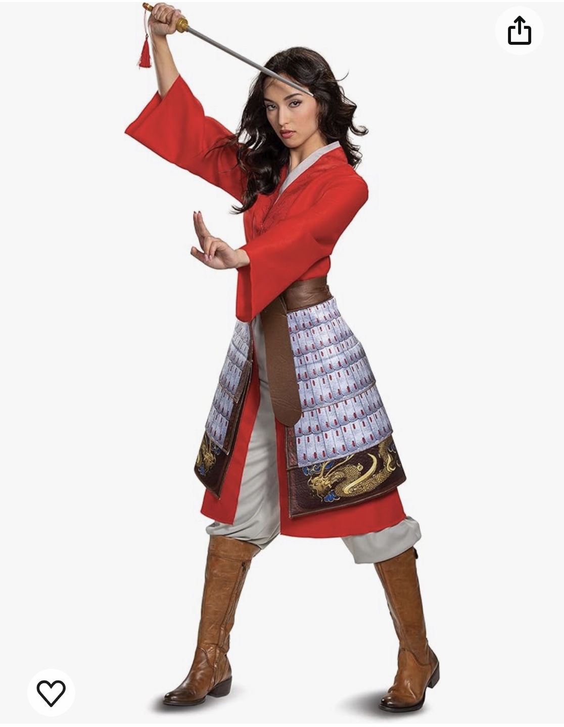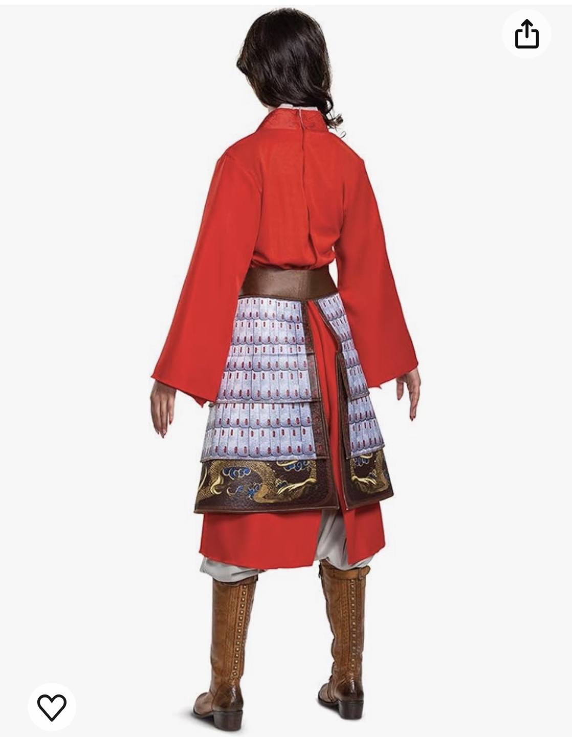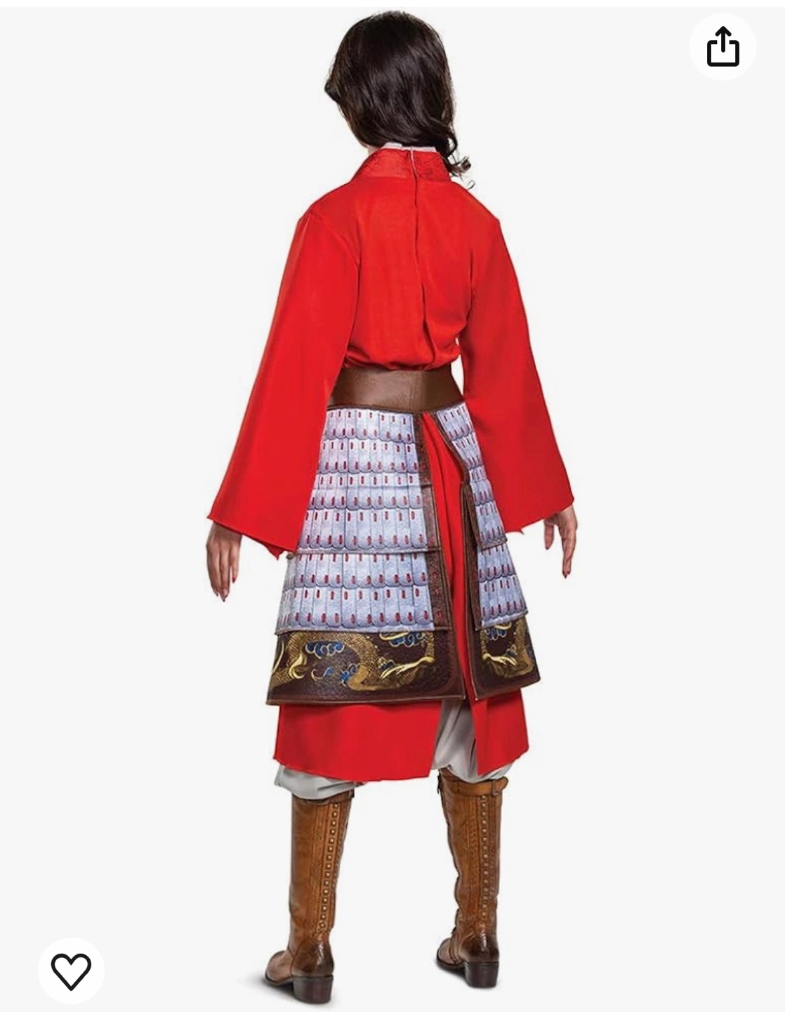 Red costume with a dragon design on the skirt. Includes a belt and pants and a sword.