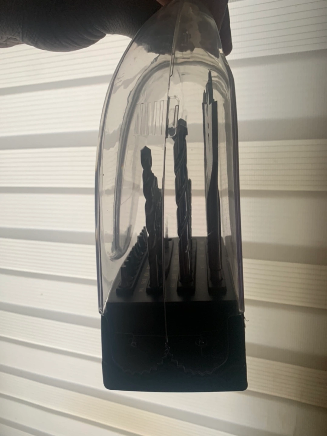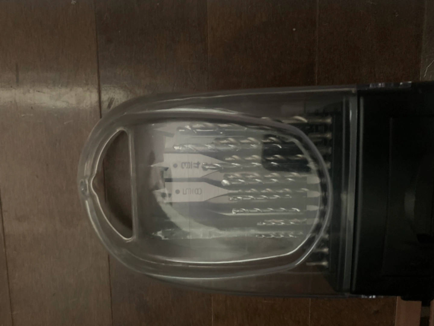 Drill bit set with 28 pieces in a clear plastic case. Includes high-speed steel drill bits, spade bits, screwdriver bits, and a magnetic bit holder.