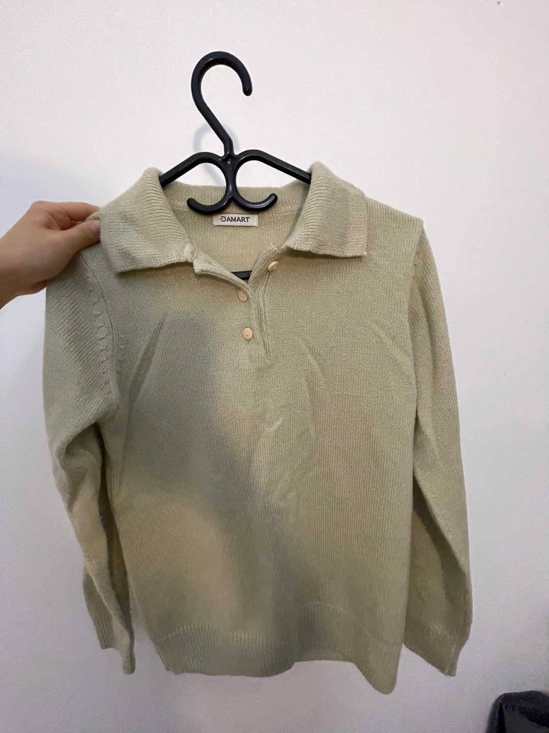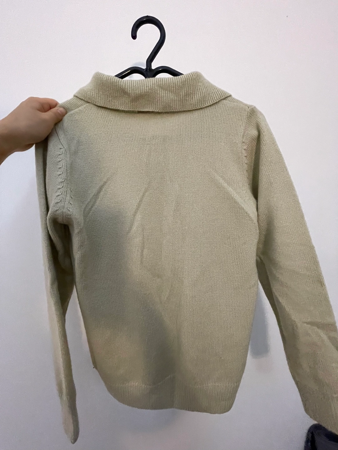 Long-sleeved, collared sweater. Button closure at the neck