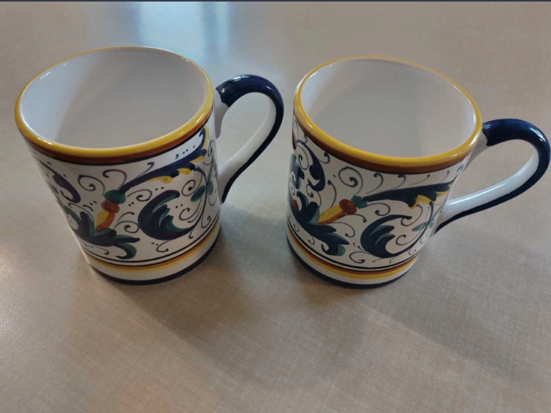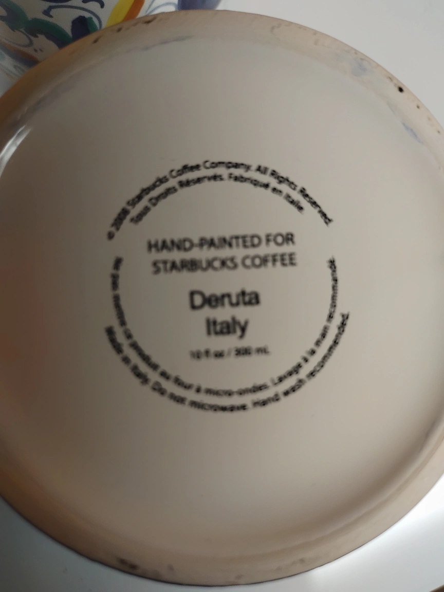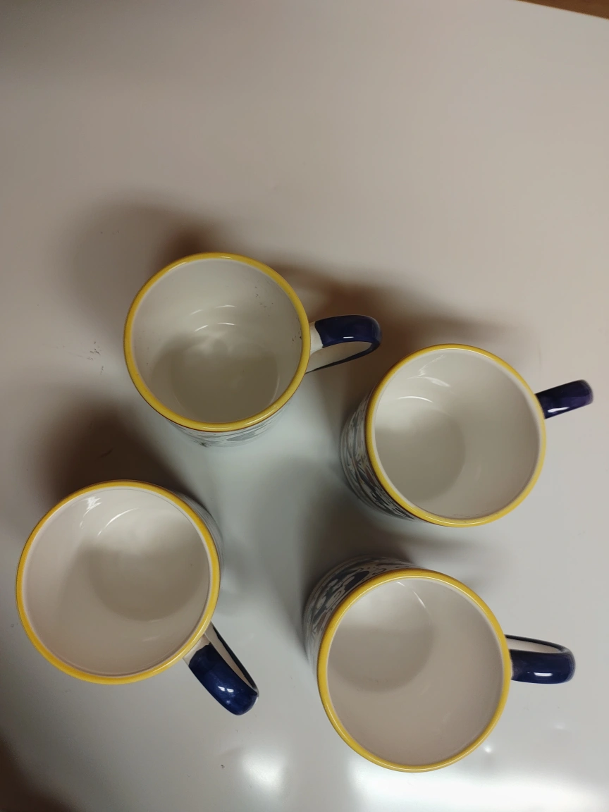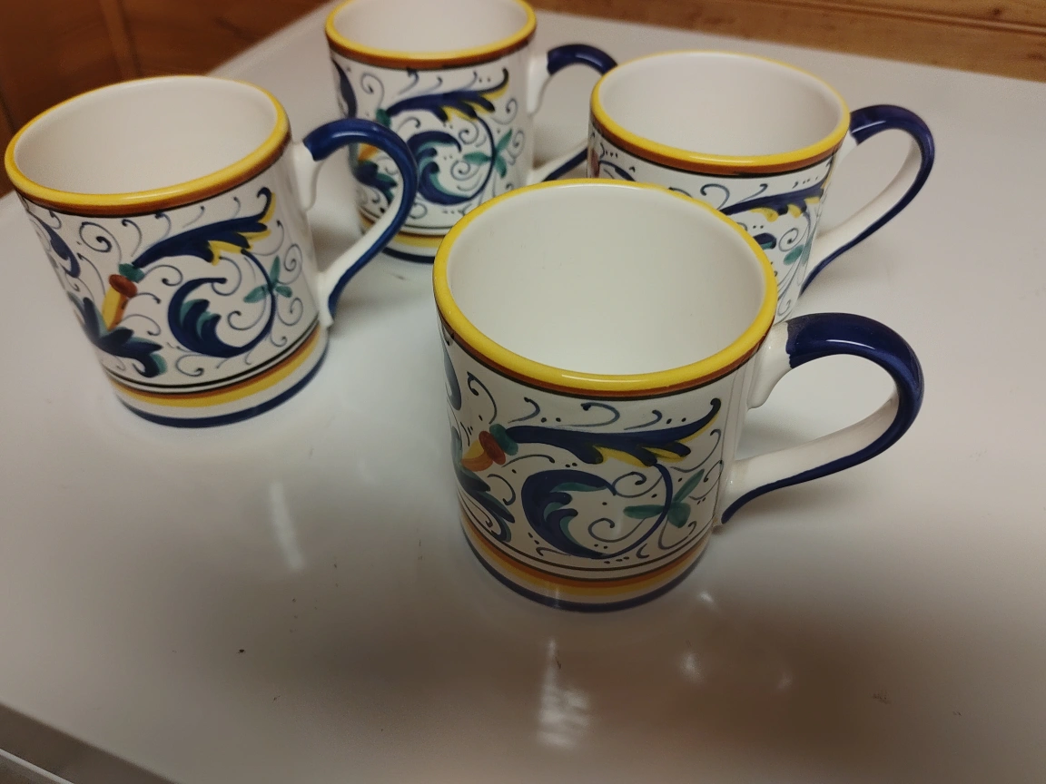 Set of 4 hand-painted mugs from Starbucks. Blue and yellow designs on white. 10 fl oz / 300 ml. Made in Italy