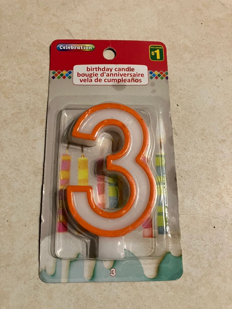 Orange and white number 3 birthday candle. The reason why I’m getting ridden the number three candle. It was my granddaughter‘s birthday and we all forgot to put it on. We baked a number three cake and just put regular candles. If anybody out there would like it. You don’t have to be three years old you can be 53 years old. You can be 63 years old whatever you’d like.