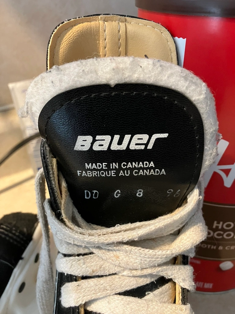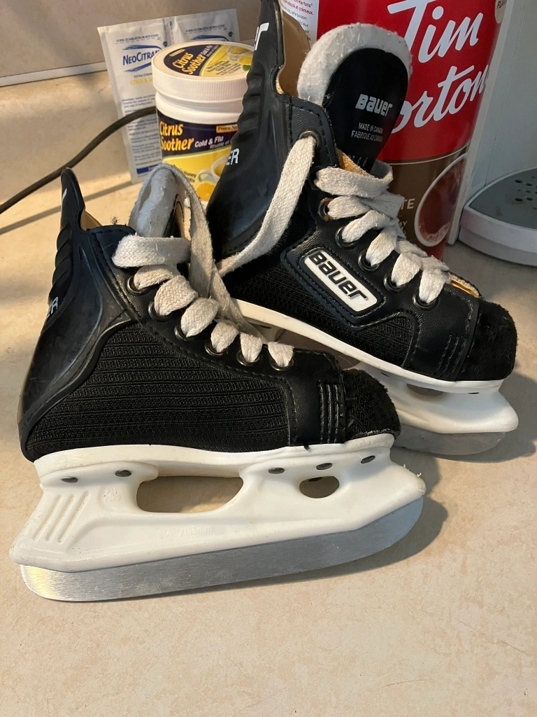 Black ice skates with white laces and a white sole. Made in Canada. Size 8 kids ages eight up asking asking $20.00 please take a look at more of my ads. I am putting more on every day.