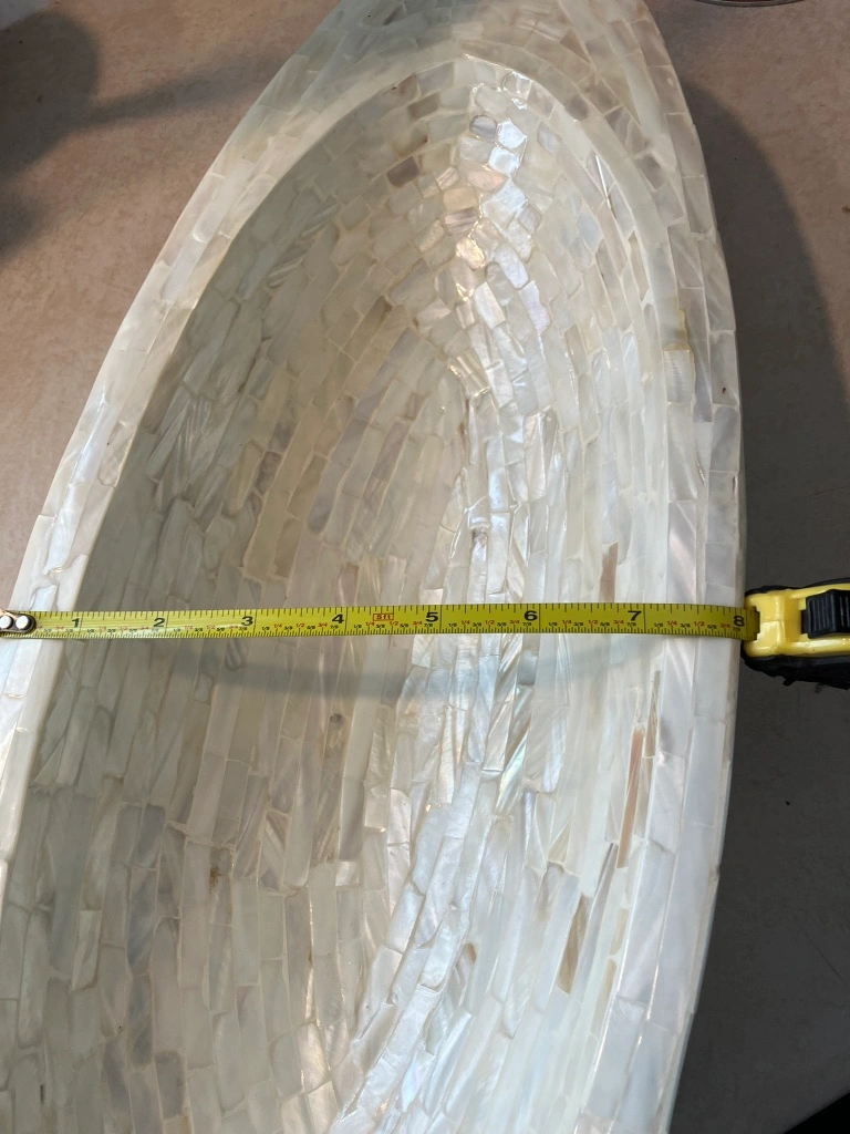 Large, oval-shaped serving dish made of mother of pearl. The dish has a slight curve and is approximately 19 inches long and 9 inches wide. Please take a look at more of my ads. I’ve been putting more and more of my mother’s stuff and grandma stuff for sale every day