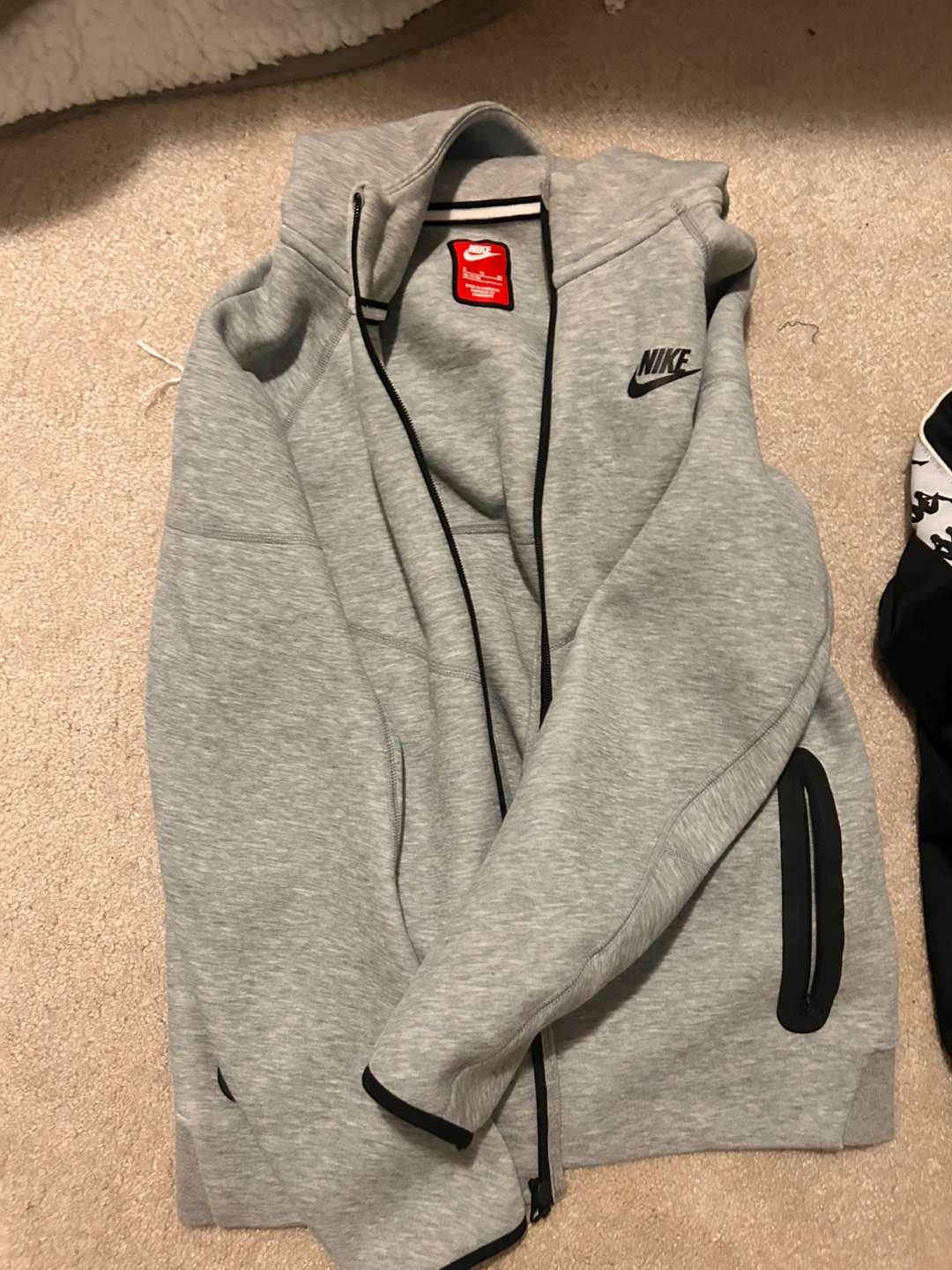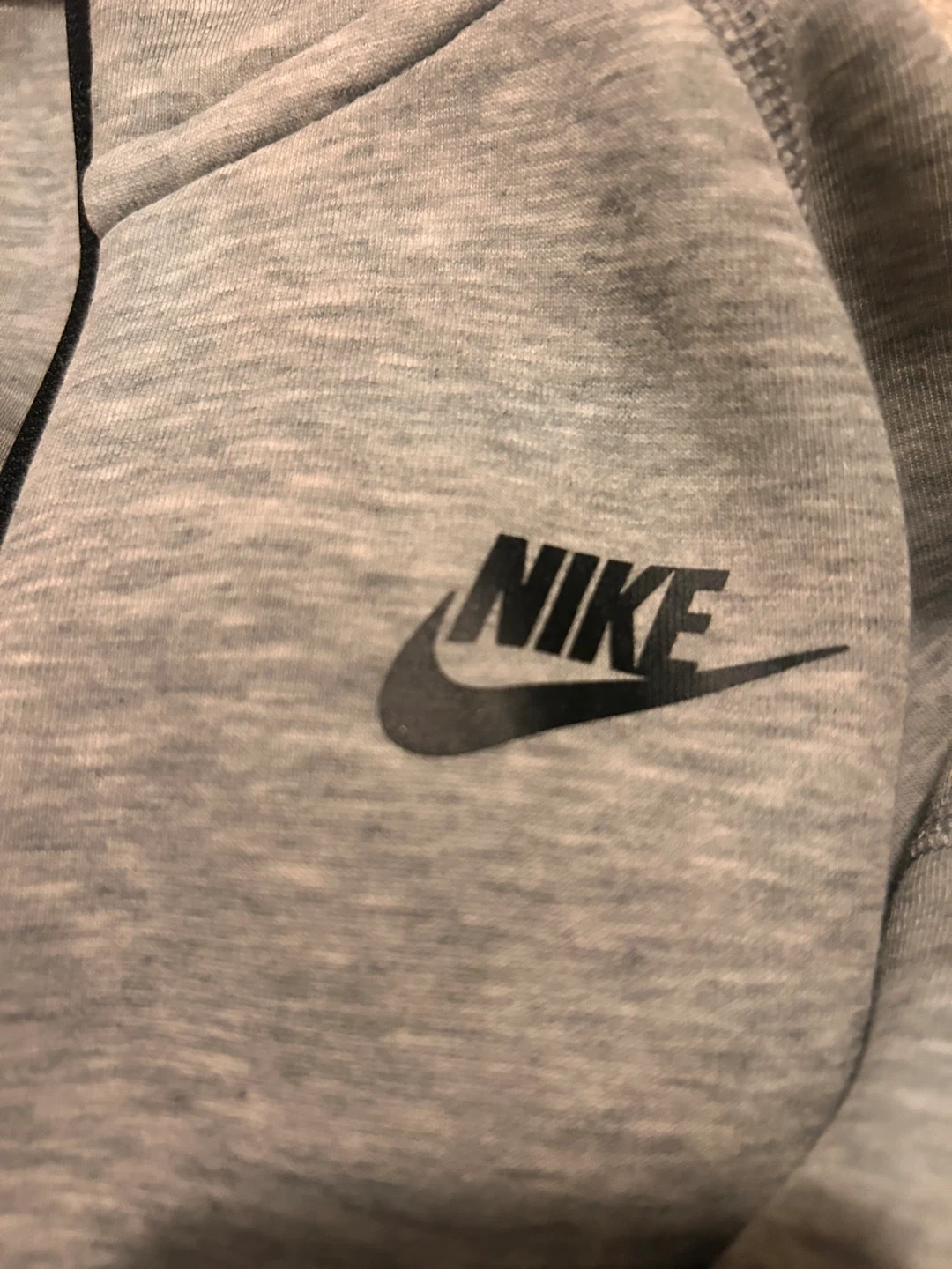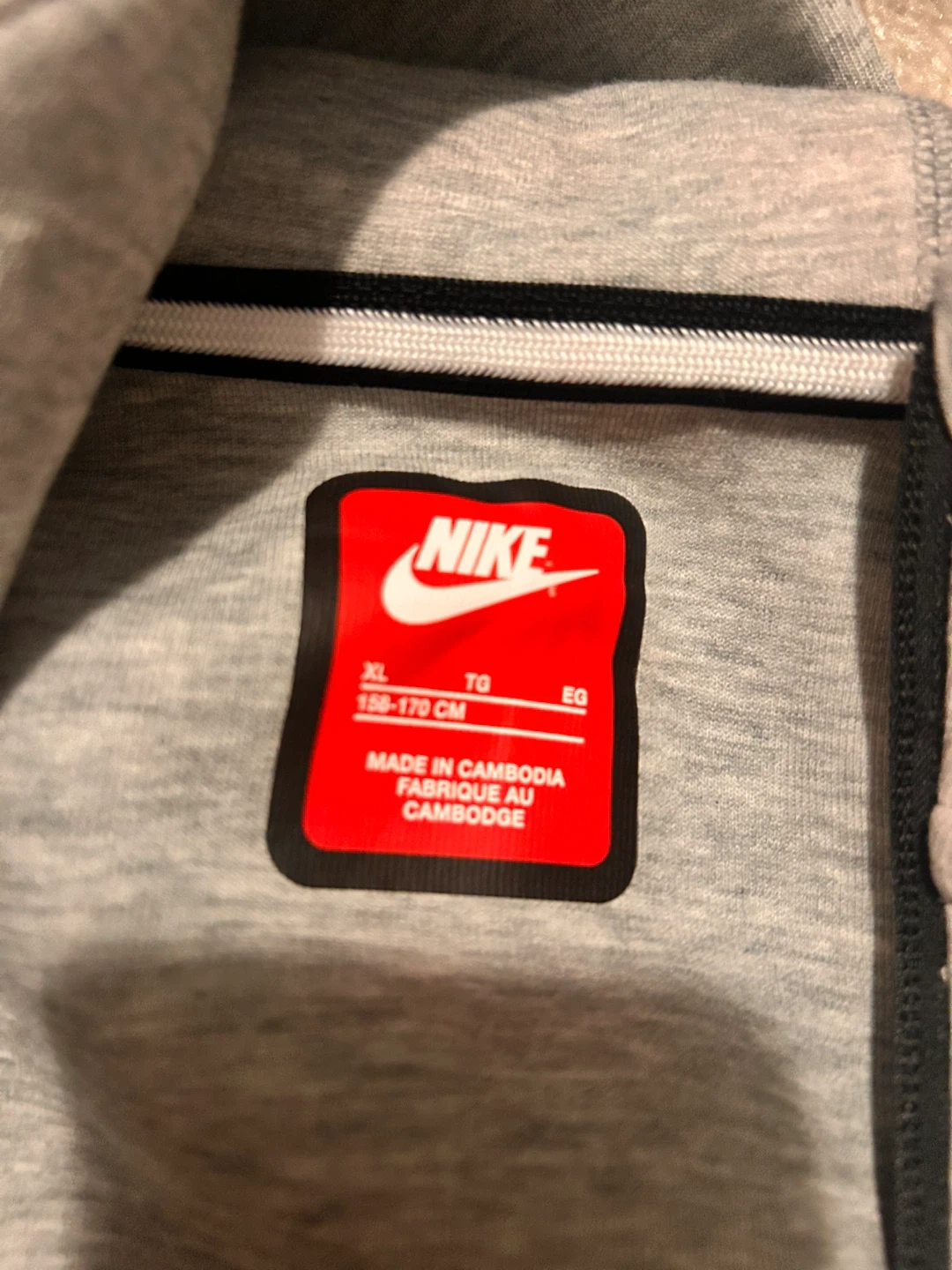 Grey Nike Tech Fleece full-zip hoodie. Size XL, fits 158-170 cm. Made in Cambodia. It's a comfy hoodie.