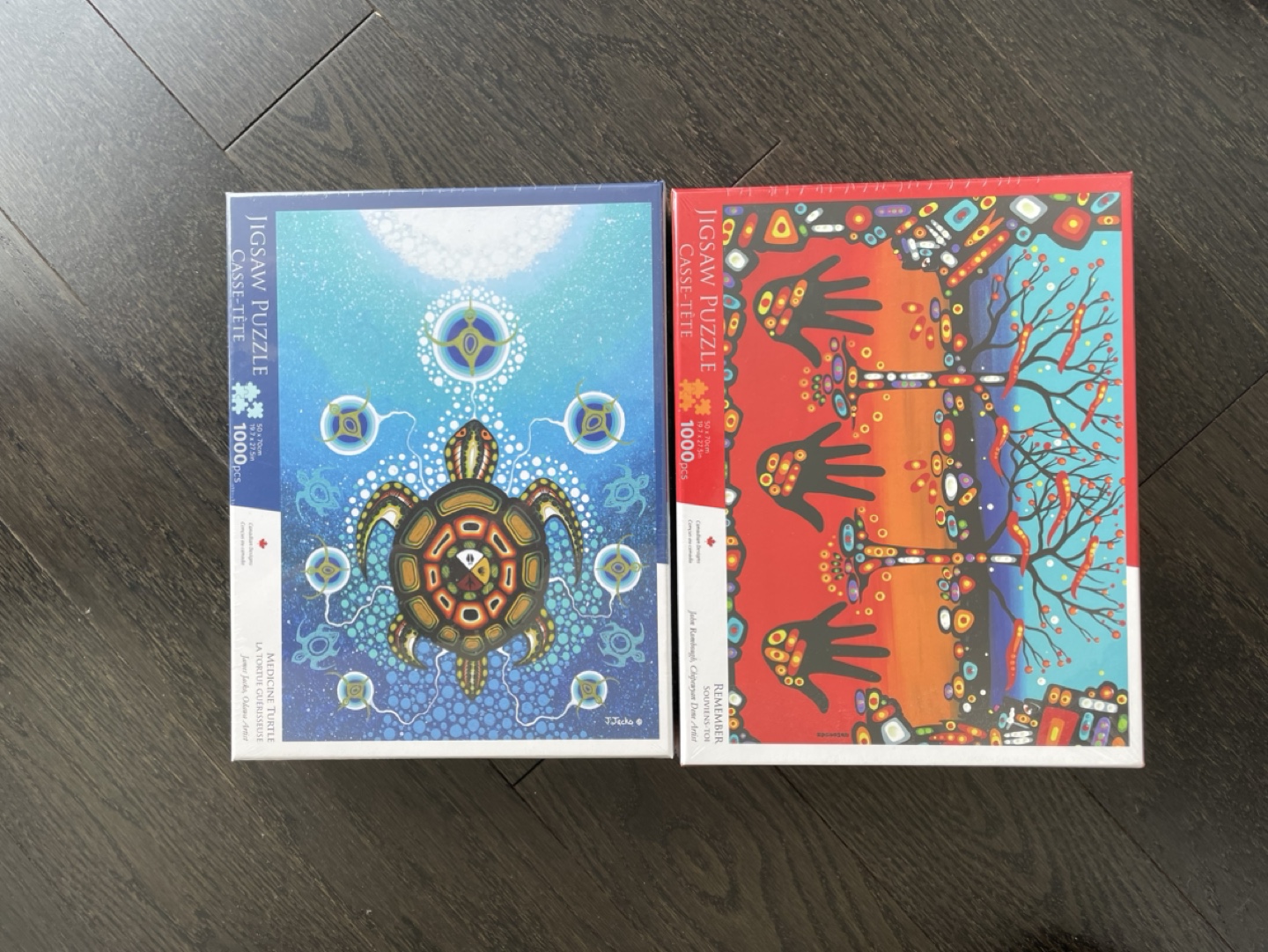Two 1000 piece jigsaw puzzles. One depicts a medicine turtle, the other depicts a red sunset and black handprints. Canadian made.