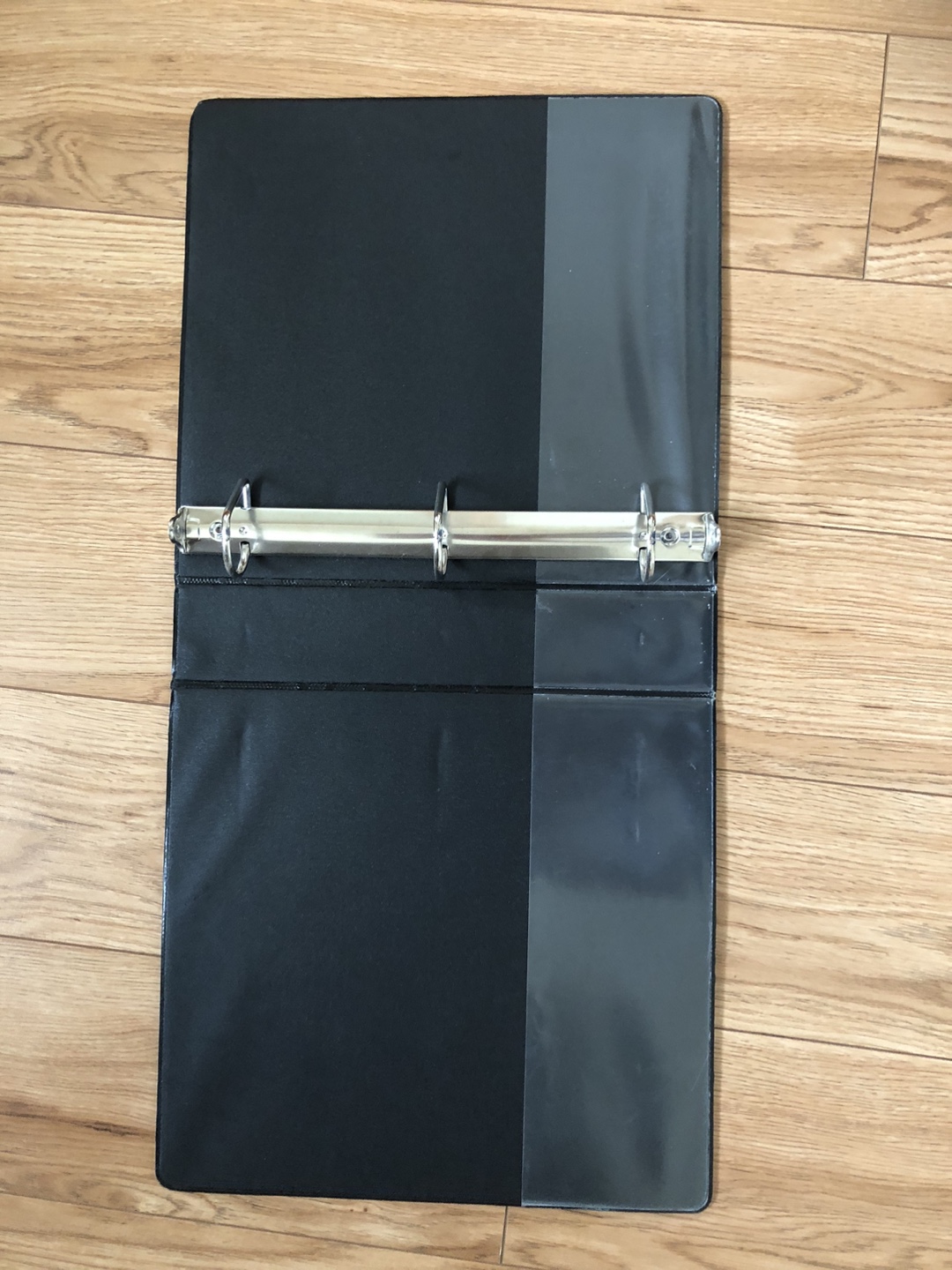 Black 3-ring binder with a clear pocket on the front and a clear pocket on the spine. Has metal rings.