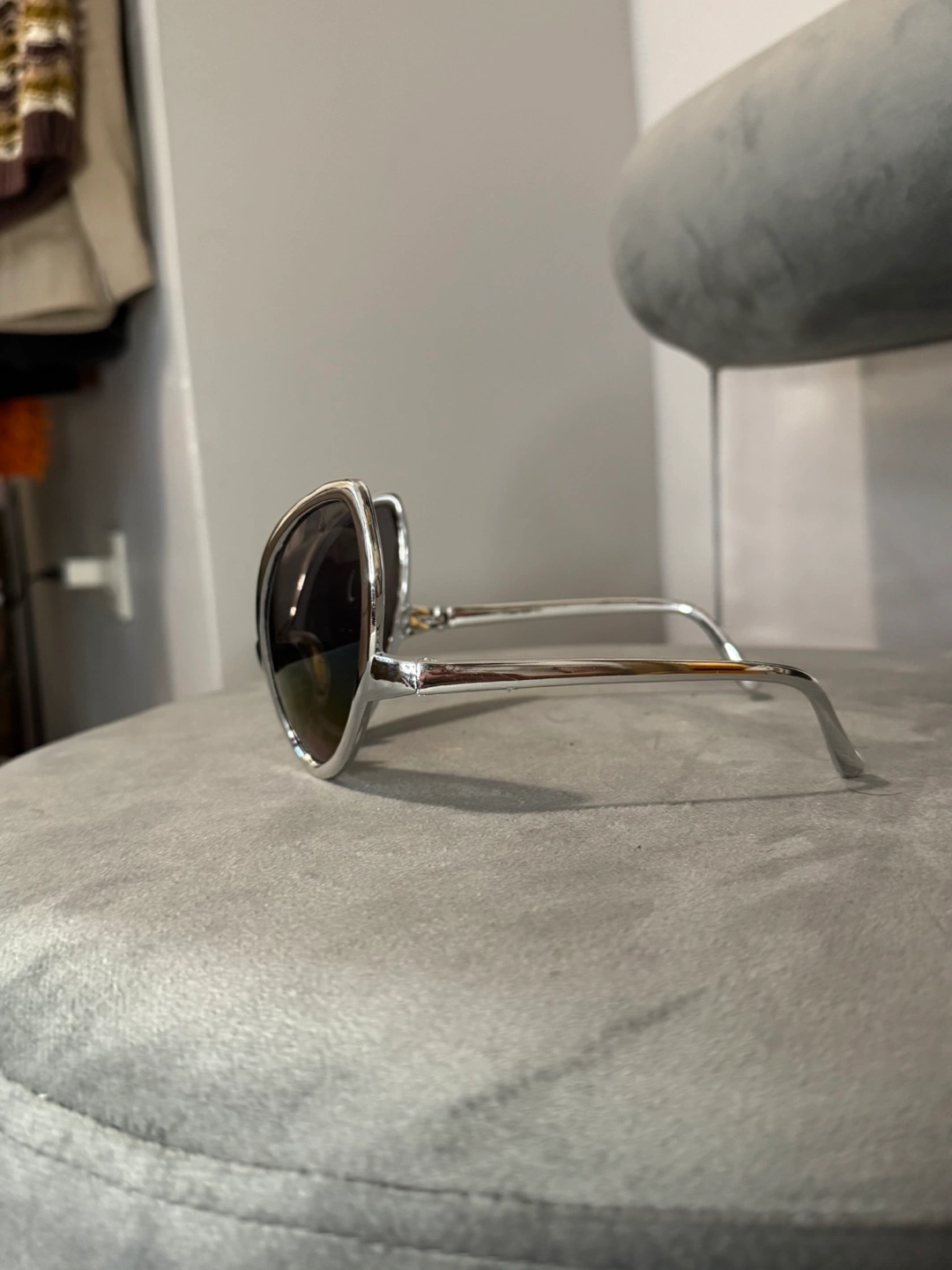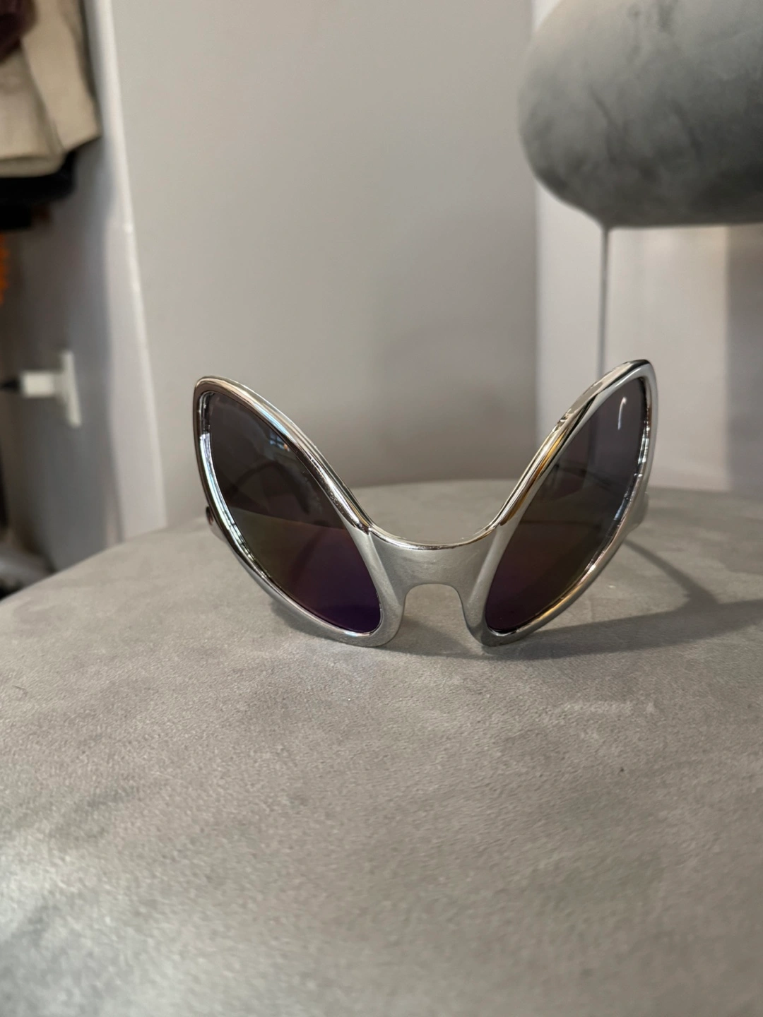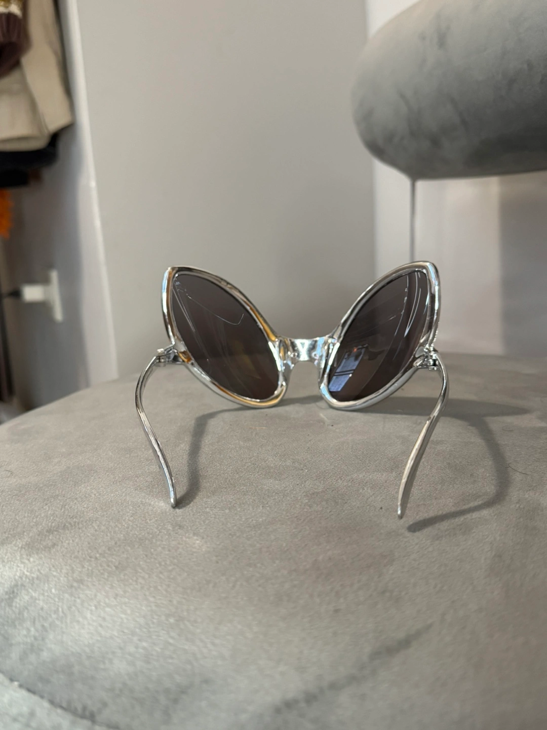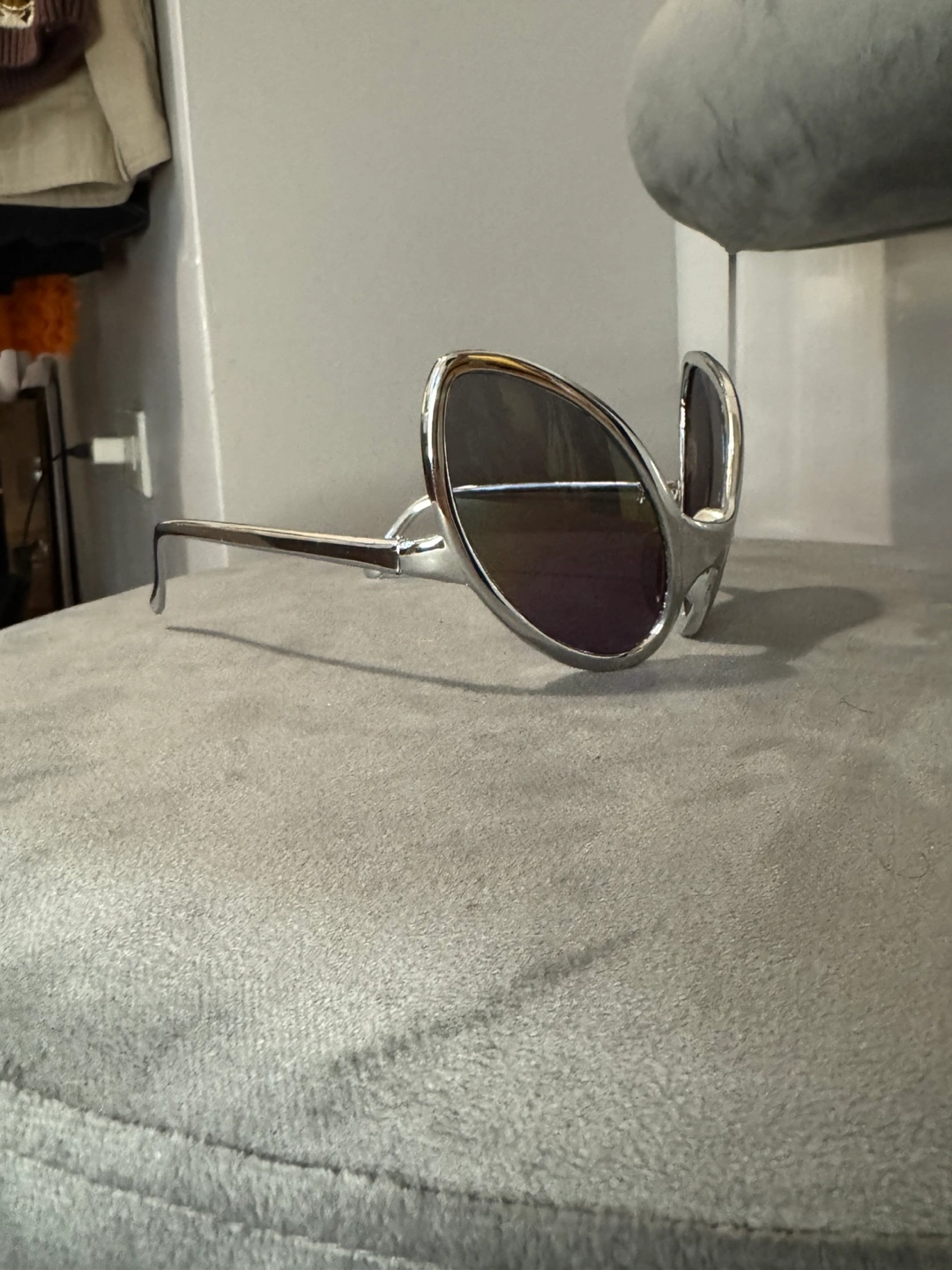 These silver alien-shaped sunglasses were purchased from Abracadabra Costume Store in NYC as a fun accessory to complete a costume. With their unique futuristic shape and mirrored lenses, they’re perfect for adding a bold, quirky touch to any outfit or costume party.