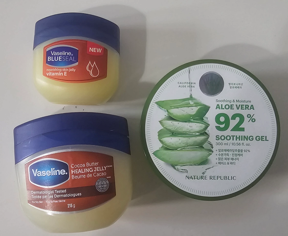 700Two jars of Vaseline and one jar of Nature Republic aloe vera gel. The Vaseline jars are both new, one is blue seal and one is cocoa butter healing jelly. The Nature Republic jar is aloe vera 92% soothing gel. PERFECT FOR WINTER... All new... PICK UP ONLY...