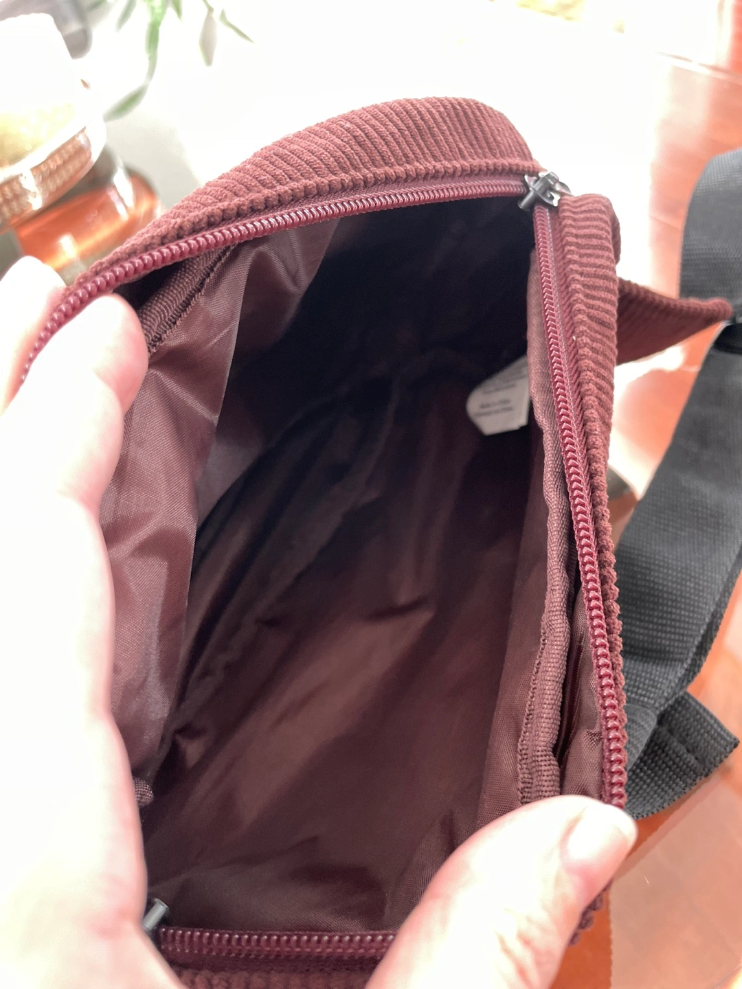 Brown corduroy with a brown polyester line. 3 zippered pockets and black clasp.