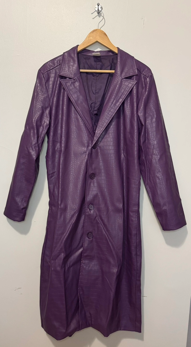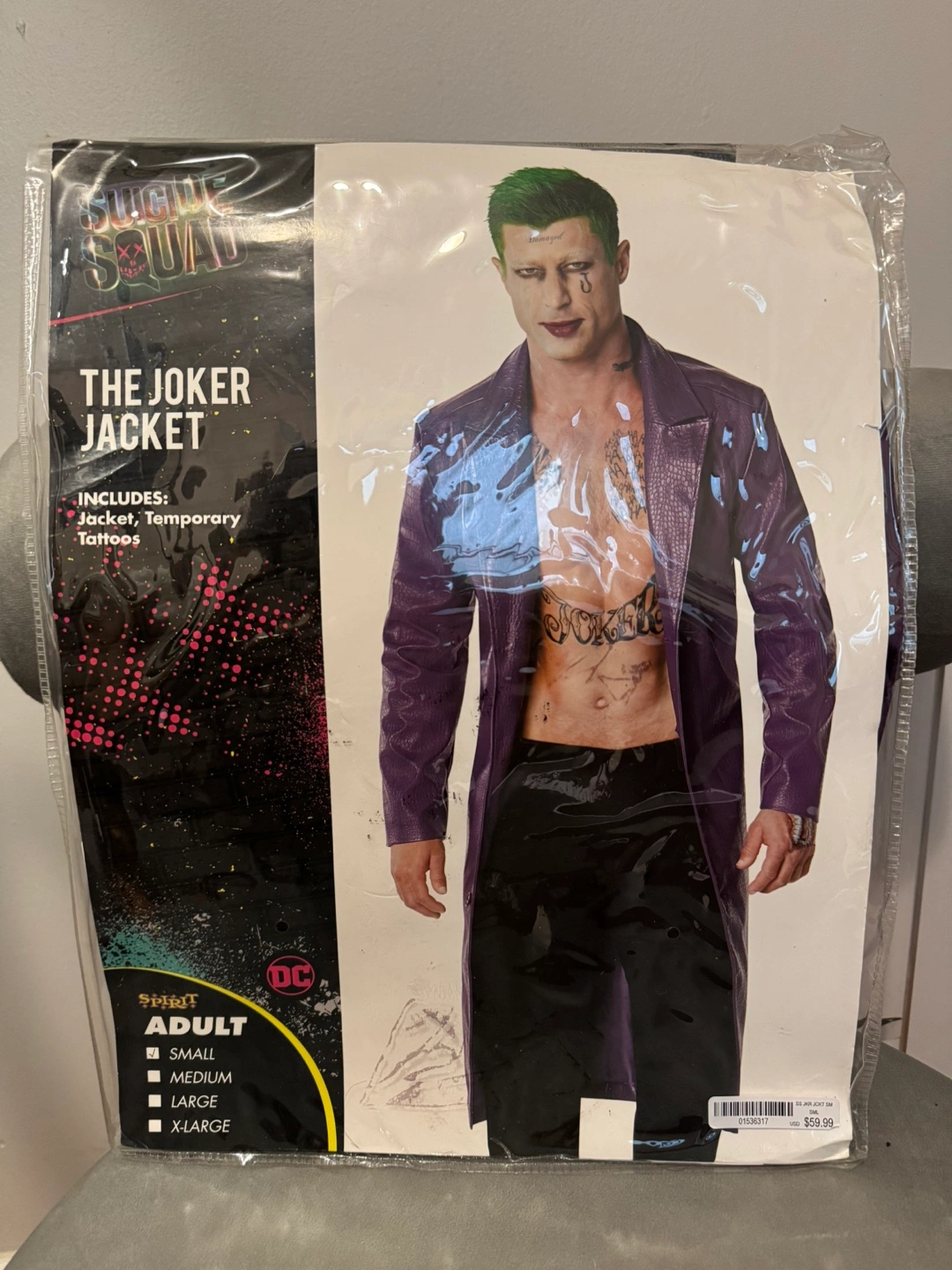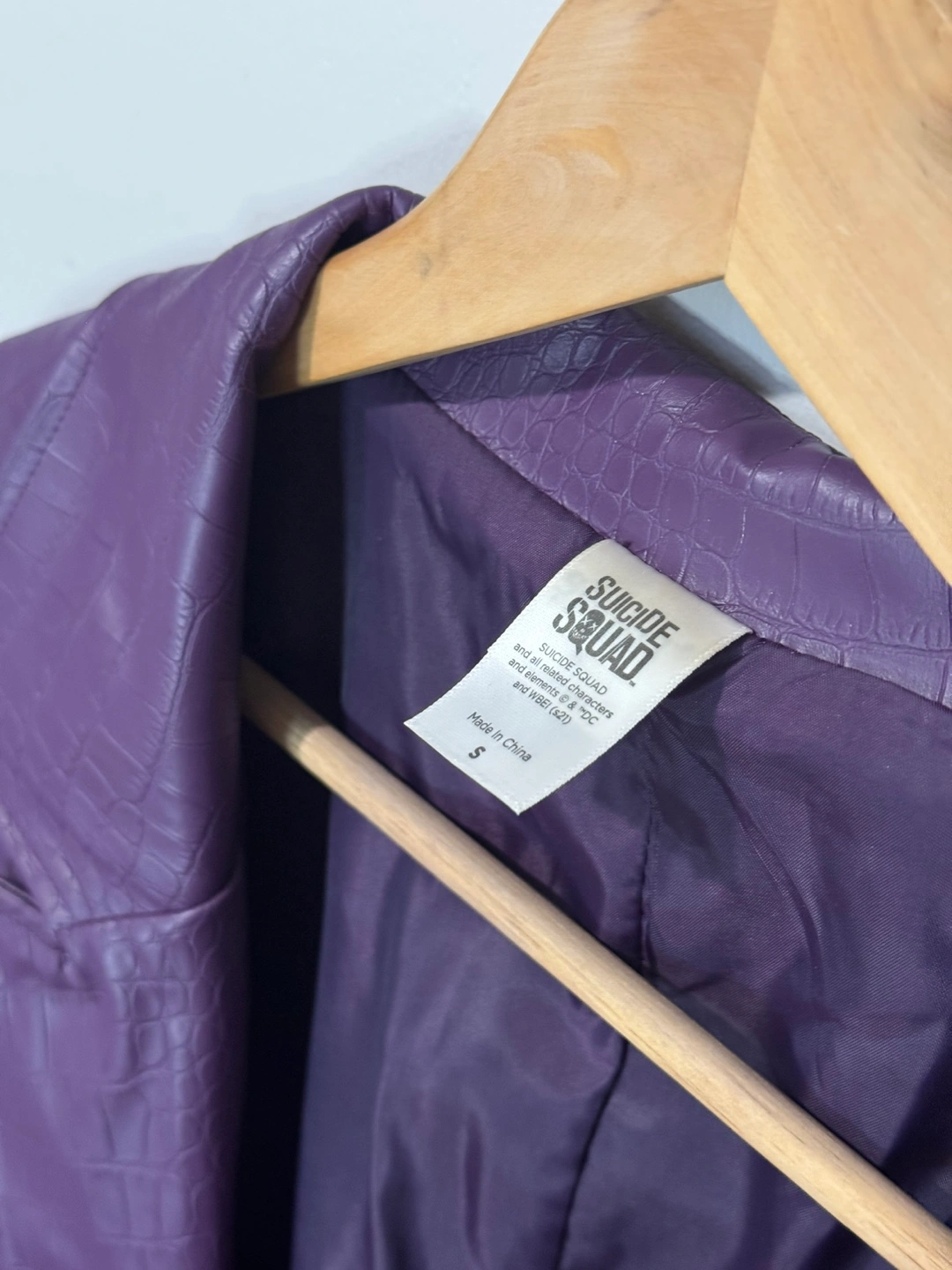 This purple Joker jacket from Suicide Squad is in excellent condition, worn only once. The costume includes the jacket and a set of temporary tattoos, though please note that the tattoo set is incomplete and one of the three is slightly damaged but should still work. This jacket is a perfect piece for any cosplay or Halloween event.