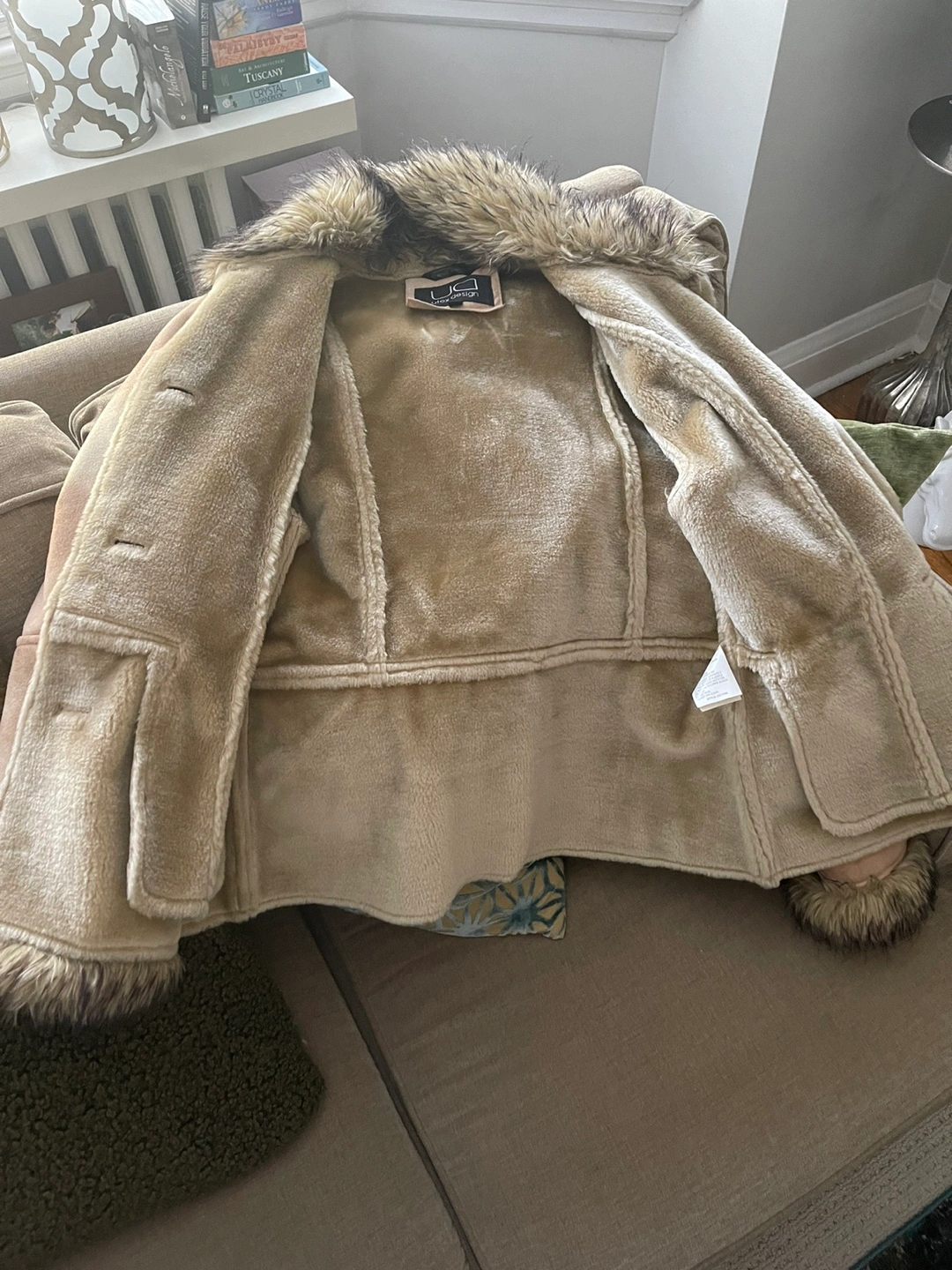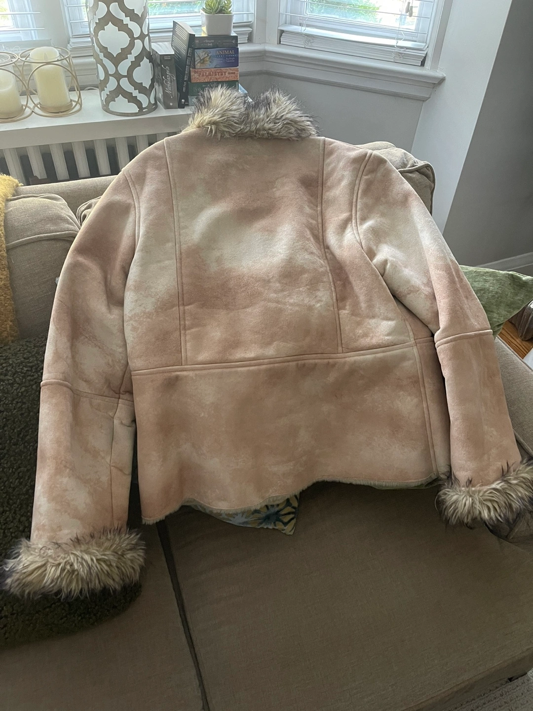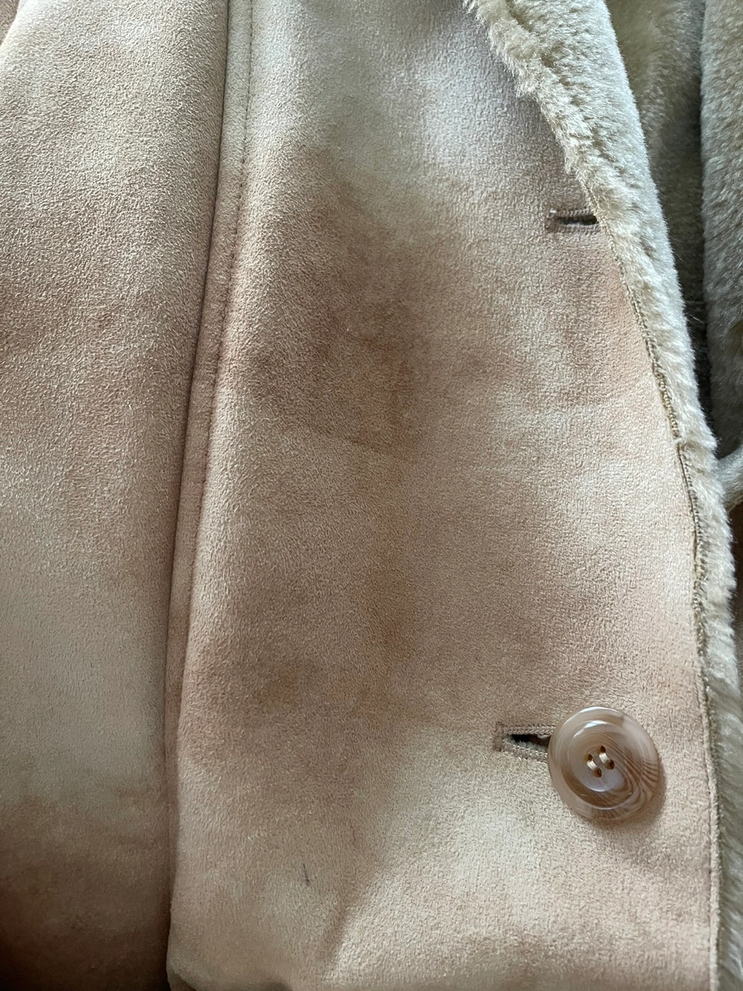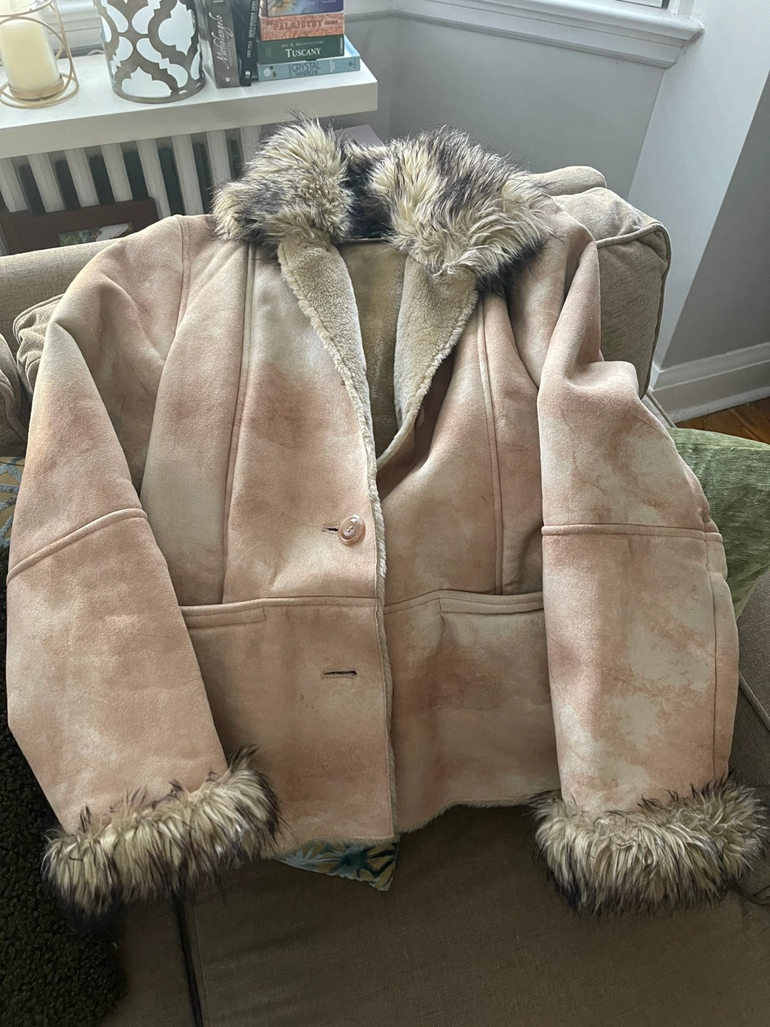 Barely worn women’s faux fur collar and cuff sheepskin coat. The close up photo is for colour purposes. The coat is not pinkish.