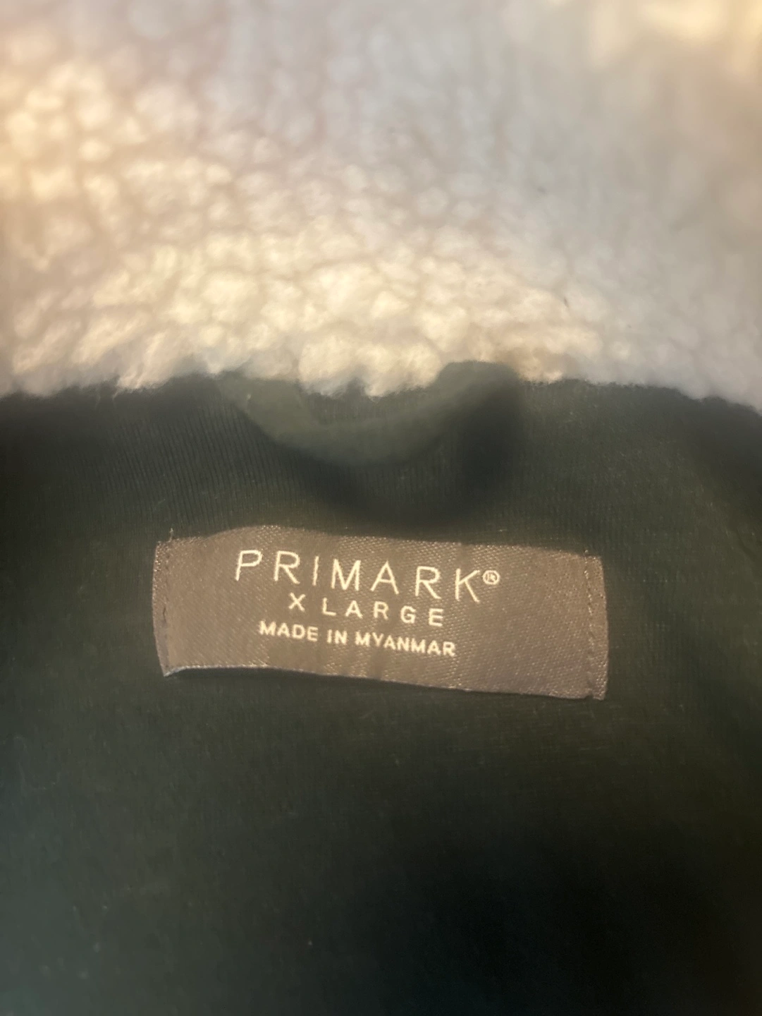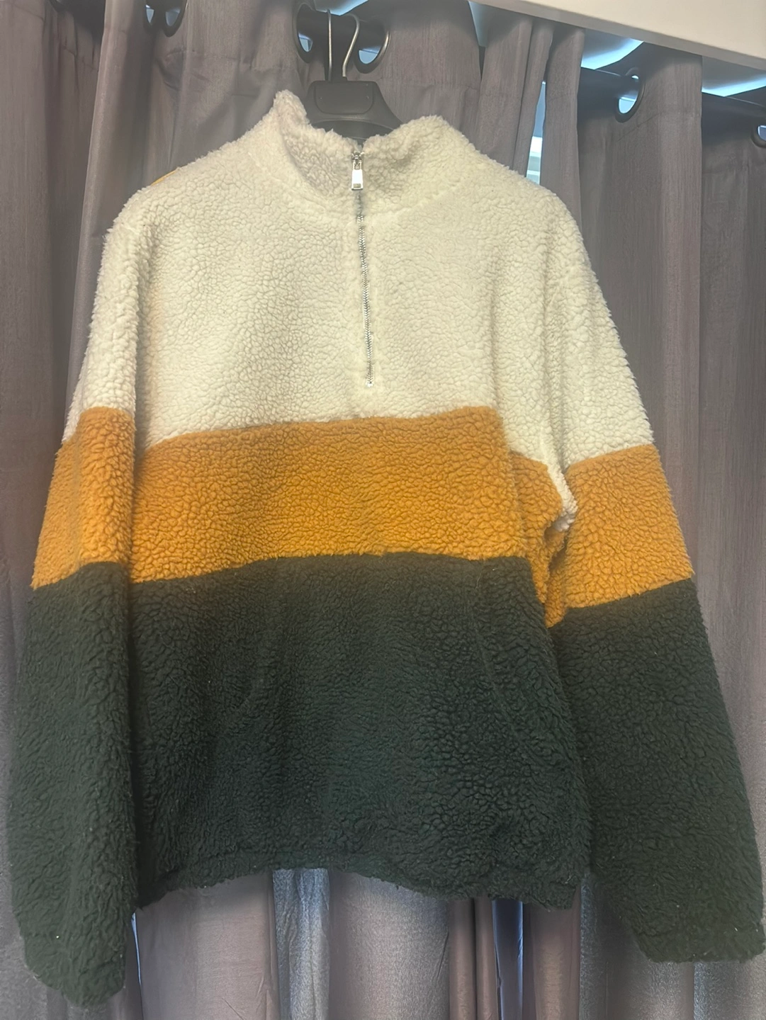 White, mustard yellow, and dark green colour block pullover. X-Large. Half zip.