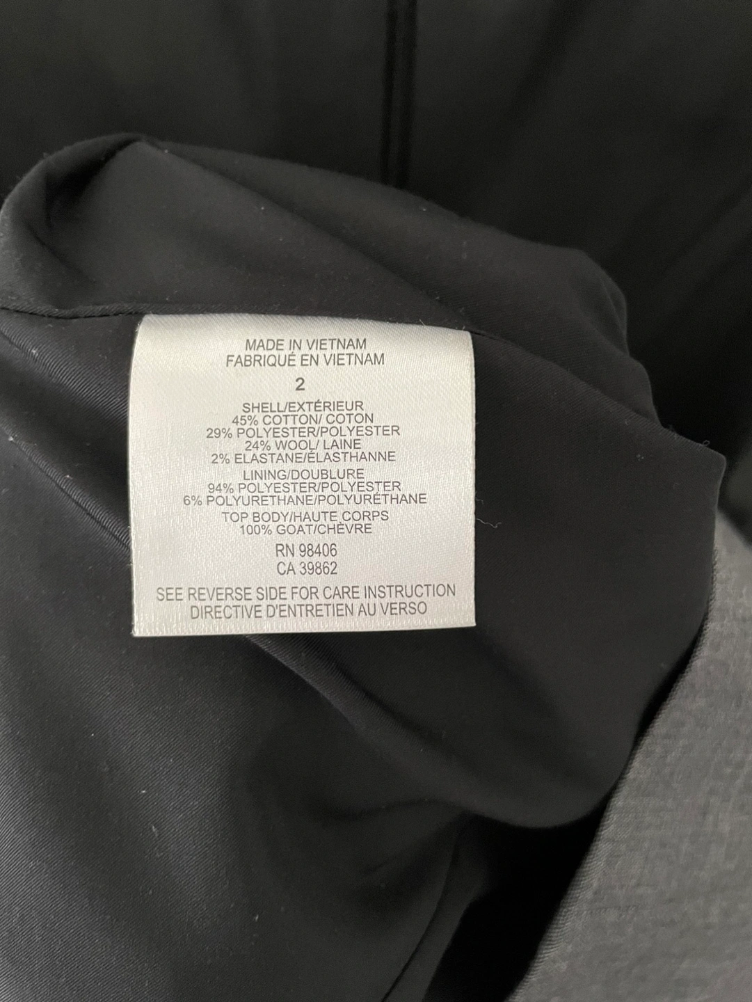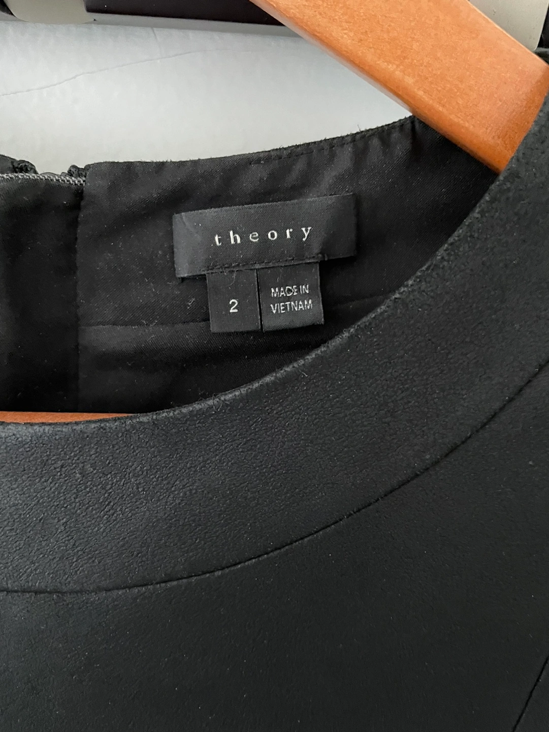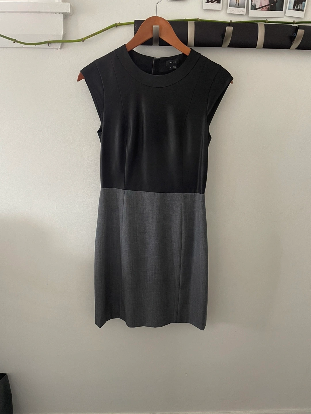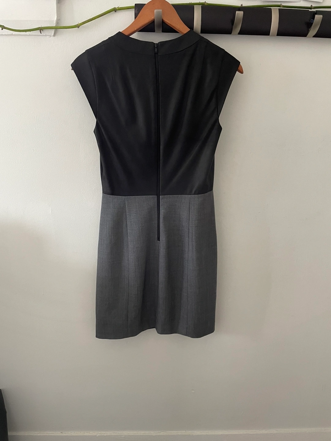 Black and grey dress with a cap sleeve and a fitted silhouette. It has a black top and a grey bottom.