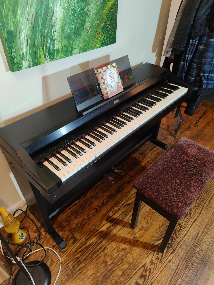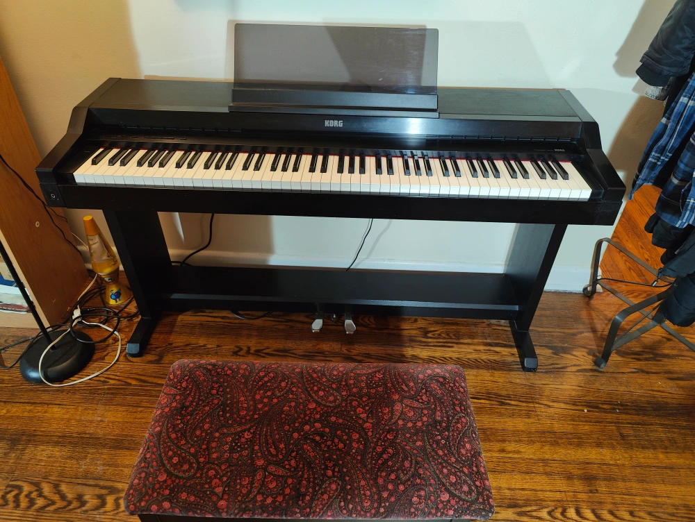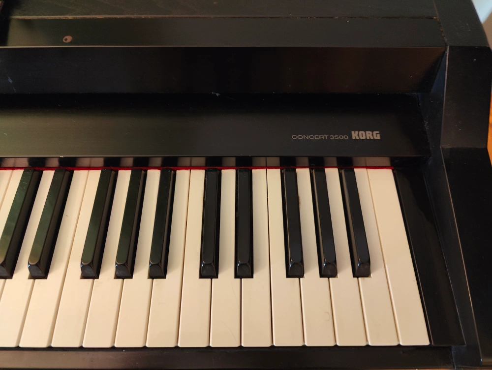 160Korg Concert 3500, 88 fully weighted keys digital piano in excellent condition. It comes with stand, music rest, power adapter, headphones, double pedal and bench. This is a quality electronic keyboard piano with 5 voices; Piano 1, Piano 2, E Piano, Harpsichord and Vibes. It also has a Chorus button / option as well as midi / transpose capability both in and out as well as audio in and out sockets. Onboard speakers with headphone socket which cuts the speakers. It has a very nice key action and a full 88 key keyboard.